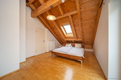 Mittig befindet sich das einzigartige Elternschlafzimmer mit Ankleidebereich sowie einem begehbaren Ankleideraum. Dieser Rückzugsort präsentiert sich besonders einladend, aufgrund reichlich Tageslicht. Ein Dachflächenfenster wie auch zwei französische Balkone ermöglichen einen tollen Blick auf den Nachthimmel. Die Holzbalkendecke sorgt für ein angenehmes Raumklima.