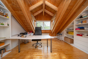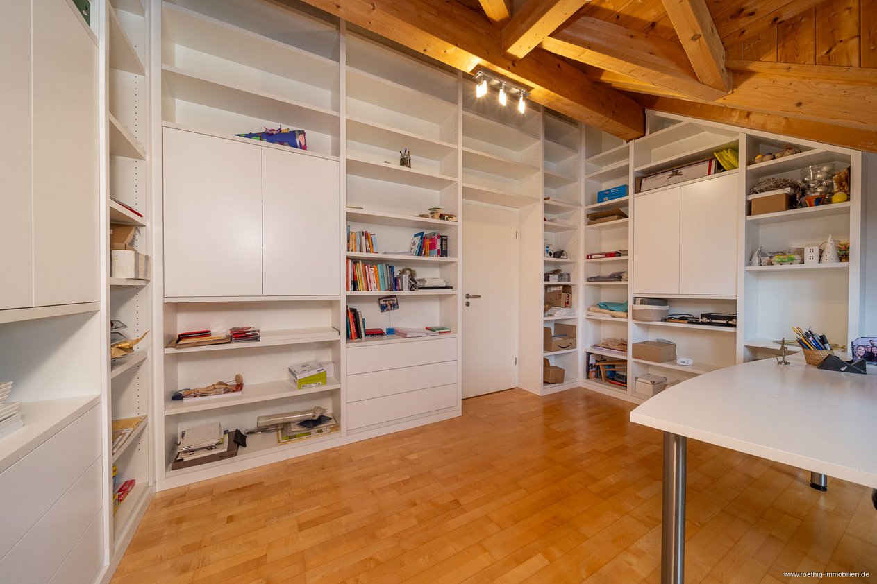 Angrenzend liegt das derzeitige Arbeitszimmer mit einer Holzgaube samt Seiten-Fenstern nach Süden. Mit einer Größe von ca. 16 m² bietet sich dieser Raum aber auch als weiteres Schlafzimmer an. Es besteht die Möglichkeit - bei Bedarf - das Arbeitszimmer mit dem begehbaren Ankleideraum zu verbinden.