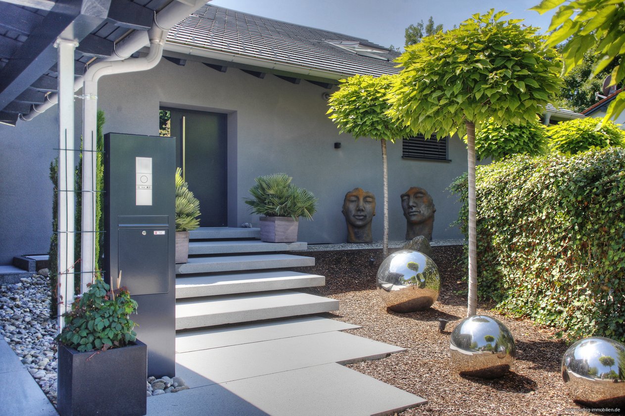 Die repräsentative Einfahrt des Hauses verbunden mit einer geräumigen Einzelgarage und überdachten Carport sowie Details wie die optisch schwebenden Stufen der Treppe zum Haus und die gepflegte Bepflanzung unterstreichen den Charakter der Immobilie.