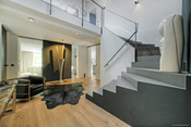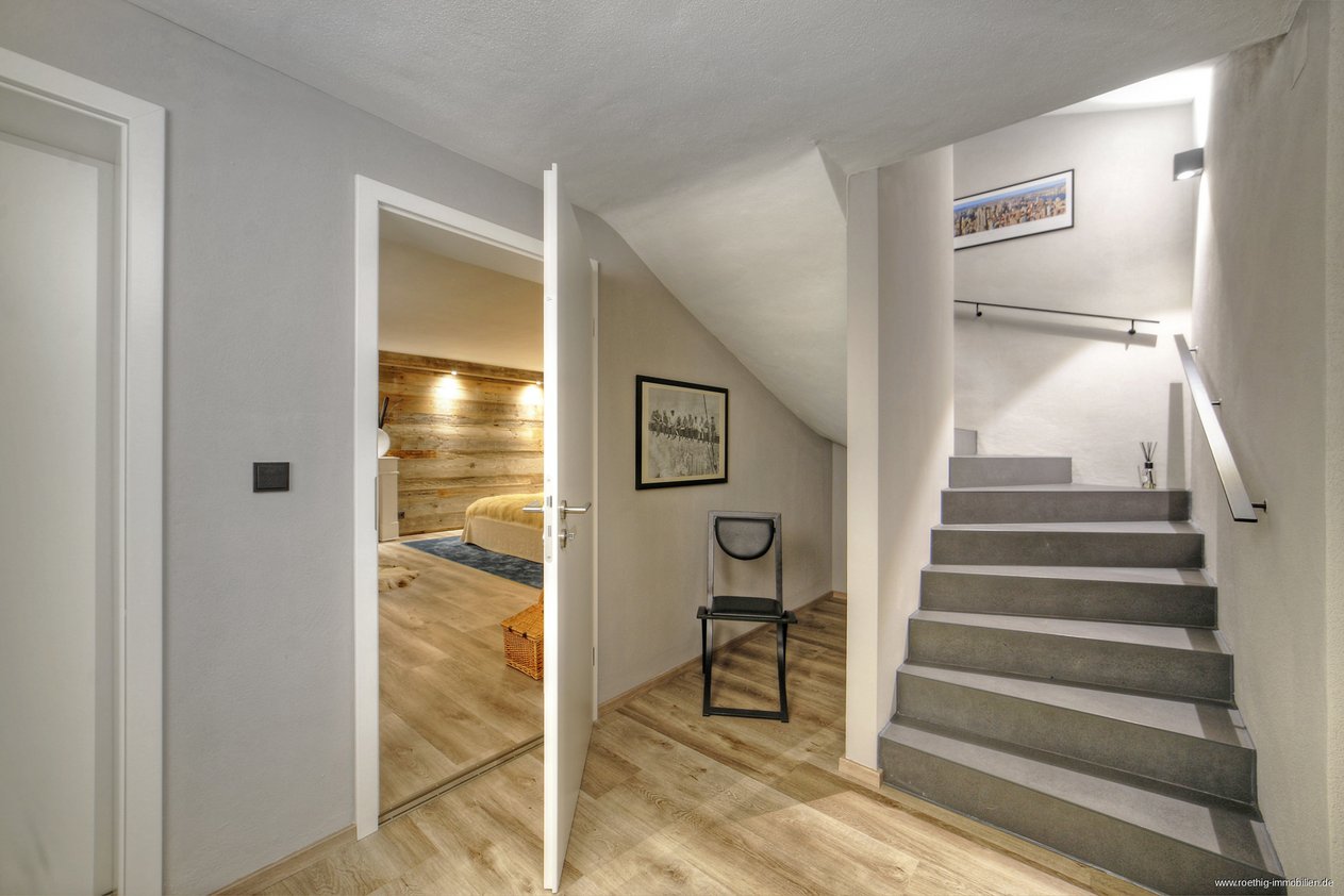 Im Obergeschoss des Hauses gelangt man direkt auf die Galerie. Hier befinden sich unter behaglichen Dachschrägen das Elternschlafzimmer, ein Fitnessstudio sowie das Hauptbadezimmer. Die großen Fenster in den Räumen sorgen für eine angenehme Belichtung.
