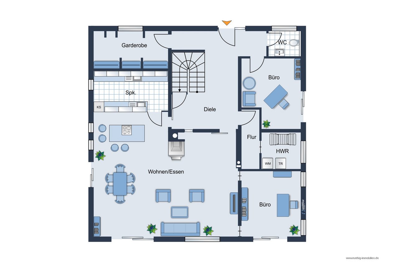 Betritt man das Haus gelangt man in den großzügigen Eingangsbereich, welcher mit Eichenparkettboden ausgestattet ist. Eine separierte Garderobe mit genügend Stauraum befindet sich auf der rechten Seite des Eingangsbereiches. In zwei möglichen Arbeitszimmern bieten bodentiefe Fenster viel Tageslicht und ermöglichen Zugang in den mediterranen Garten. Zusätzlich befinden sich auf dieser Etage ein Gäste-WC, sowie ein Hauswirtschaftsraum, welcher zu einem Badezimmer umgebaut werden kann.
