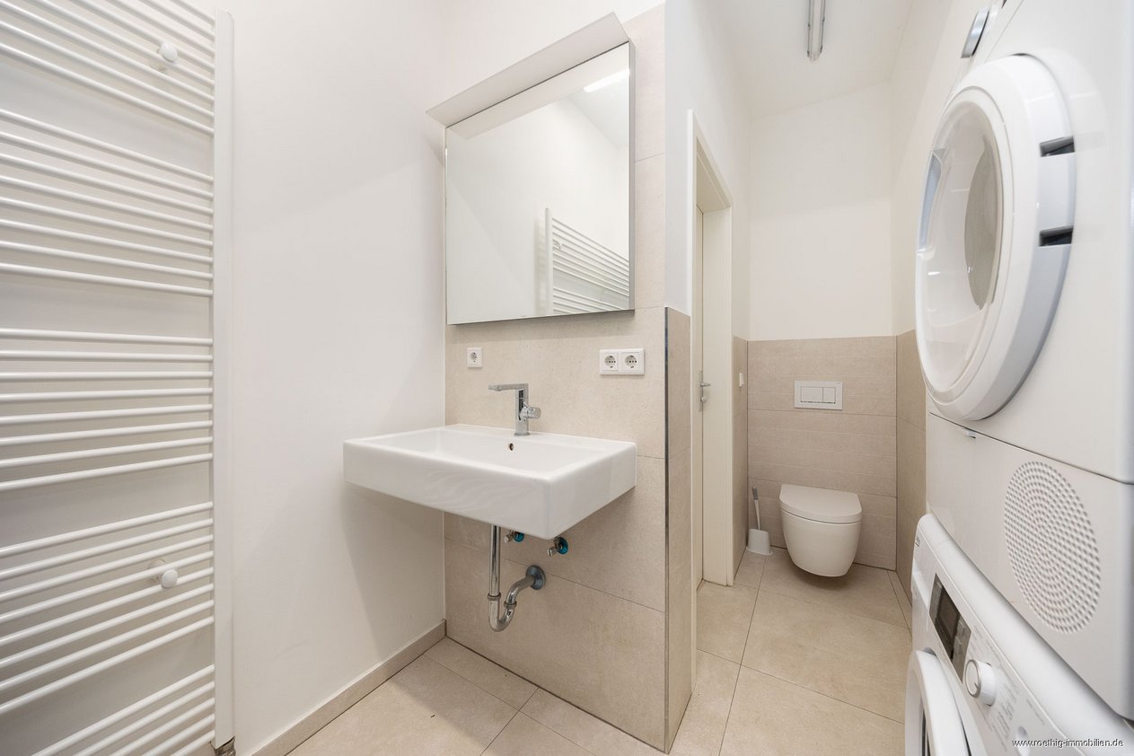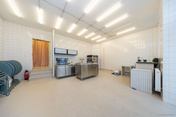 Das neuwertige Mitarbeiterbad ist modern ausgestattet und verfügt über ein WC, eine bodentiefe Regendusche sowie über einen Anschluss für Waschmaschine und Trockner. So können Arbeitskleidung und Textilien bequem direkt vor Ort gereinigt werden – ein echter Vorteil im Betrieb. Für Mitarbeiter auch prima als Umkleide geeignet.