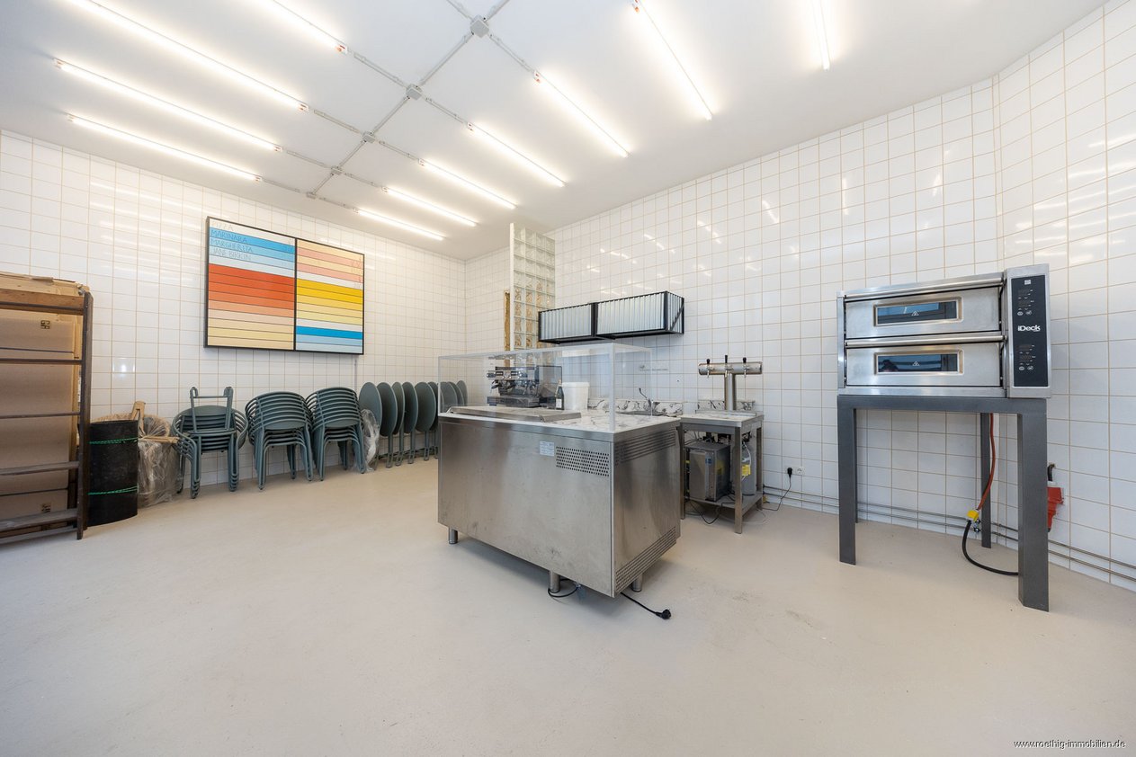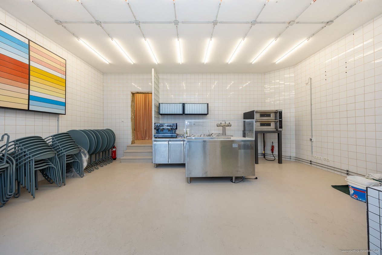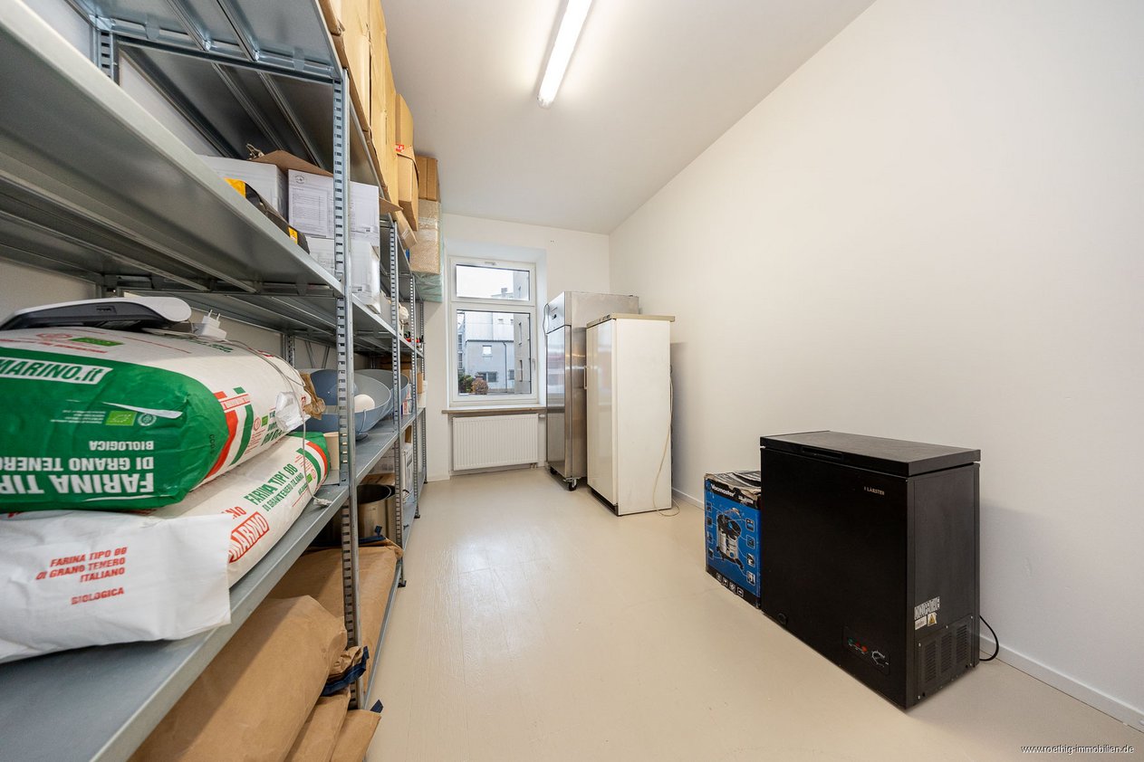 Im hinteren Bereich der Gewerbefläche stehen Ihnen weitere Räume zur Verfügung. Dazu gehören die Küche, ein Gäste-WC, ein Lagerraum, ein Mitarbeiterbad sowie ein weiterer, vielseitig nutzbarer Raum im Souterrain.