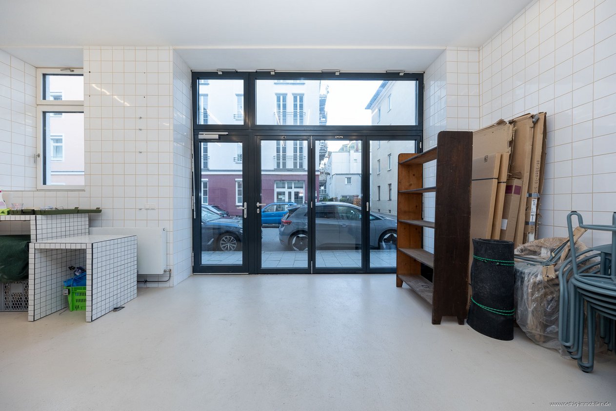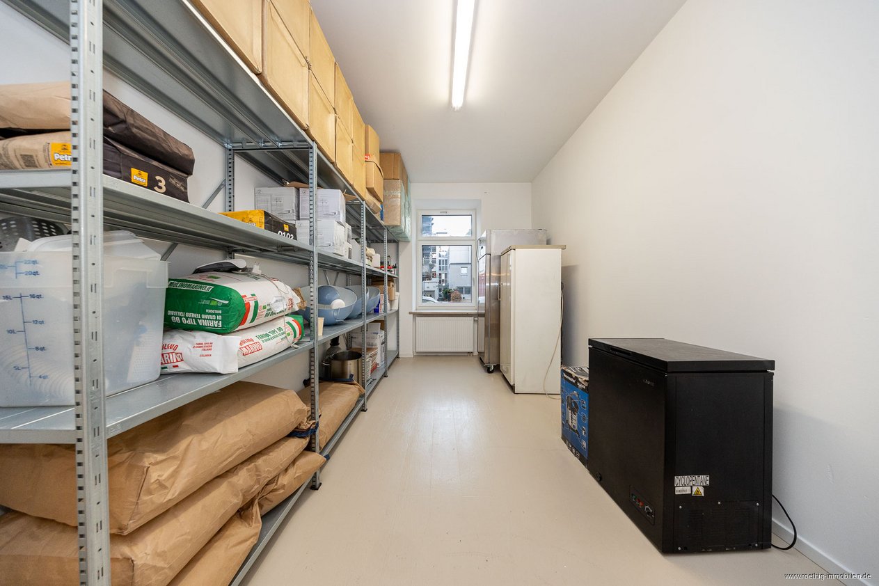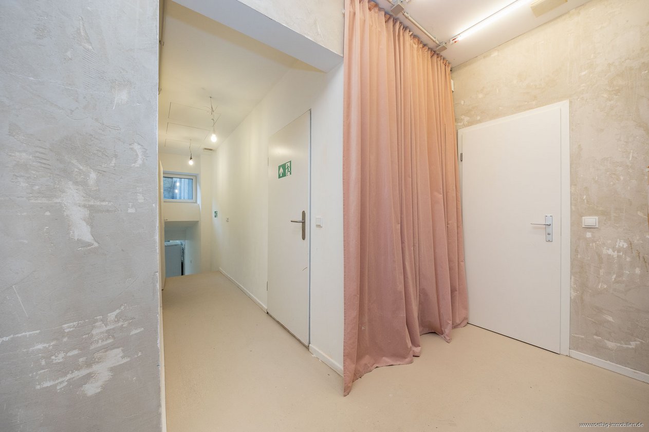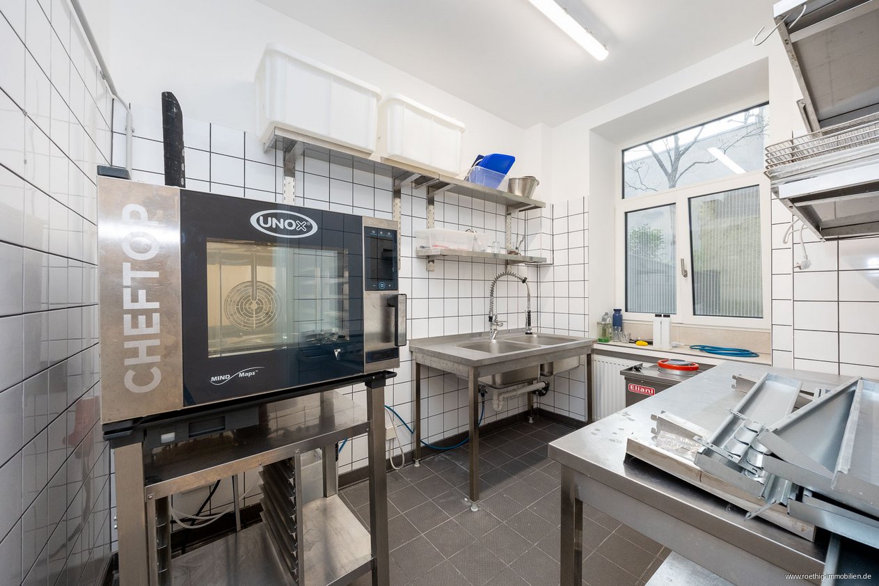 Im hinteren Bereich der Gewerbefläche stehen Ihnen weitere Räume zur Verfügung. Dazu gehören die Küche, ein Gäste-WC, ein Lagerraum, ein Mitarbeiterbad sowie ein weiterer, vielseitig nutzbarer Raum im Souterrain.