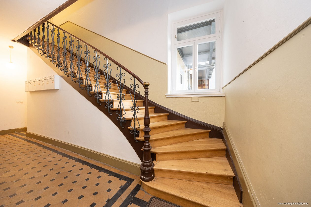 Neben dem direkten Zugang über die Ladentür ist die Einheit auch bequem über das repräsentative Treppenhaus mit absolutem Altbaucharme erreichbar.