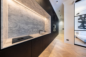 Auch im Alltag überzeugt die Küche mit Ihren durchdachten Details: Ein Gefrierschrank mit Ice-Maker, ein Waschtrockner mit Waschmitteldosierung, ein integrierter Wäschesortierer sowie eine elegante Staubsaugerstation mit eigener Steckdose sind perfekt und dezent integriert. Die großzügige Arbeitsfläche aus edlem Marmor – abgestimmt auf die anderen Räumlichkeiten der Wohnung – beherbergt flächenbündig eingelassene Steckdosen sowie eine geschickt integrierte Beleuchtung.