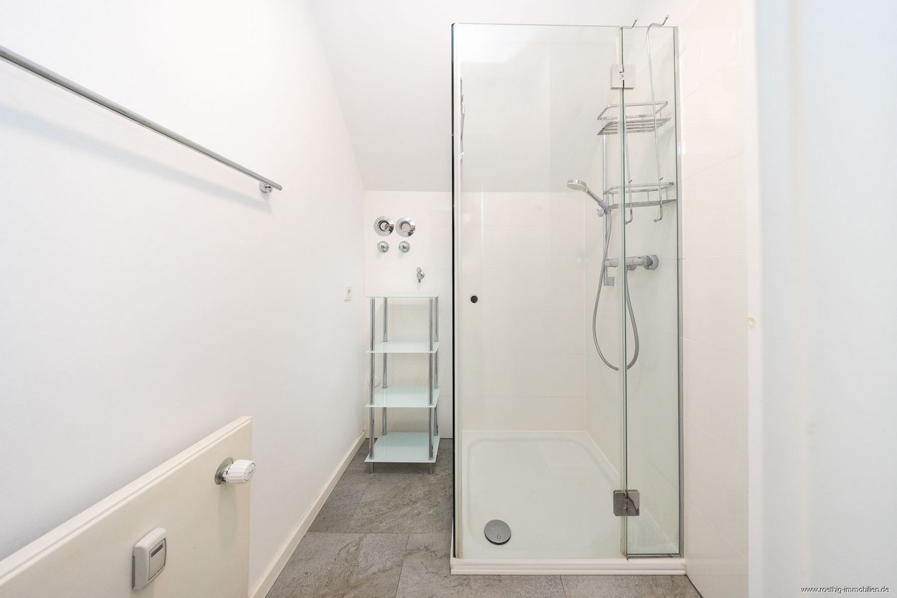 Linker Hand zur Eingangstür befindet sich ein praktischer, halbhoch gefliester Hauswirtschaftsraum mit Belüftung. Dort finden Sie neben einer bodentiefen, verglasten Dusche zusätzlich ausreichend Platz für eine Waschmaschine und Trockner.