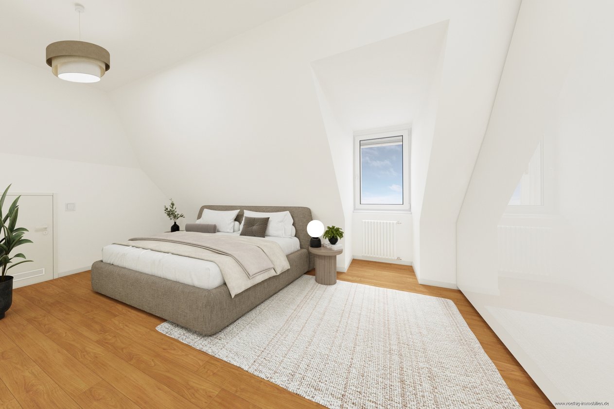 Das Schlafzimmer (ca. 15 m²) bietet reichlich Platz für ein komfortables Doppelbett und präsentiert sich mit einer breiten Fenstergaube in sonniger Südostlage, welche den Raum hell erstrahlen lässt und den Blick auf die grünen Baumkronen des Innenhofs eröffnet. Für Ihre Garderobe steht ein eleganter, raumhoher Einbauschrank von ca. 3 Metern Länge bereit, ergänzt durch praktischen Stauraum in der sanft abgeschrägten Abseite.