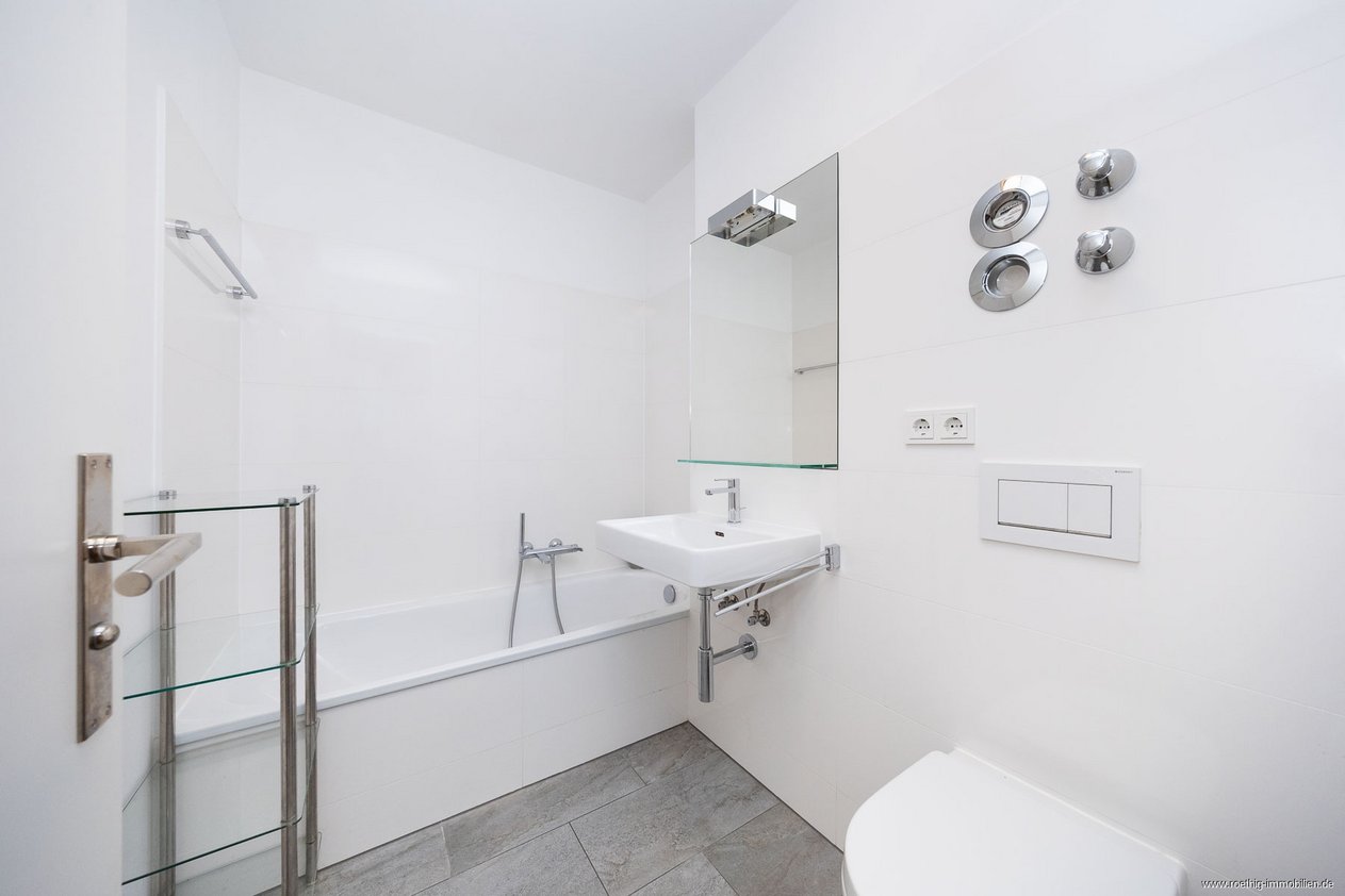 Das, in elegantem Weiß, halbhoch-geflieste Badezimmer ist mit einer Badewanne, einem beleuchteten Spiegel und einer Belüftung ausgestattet. Der anthrazitfarbene Boden setzt einen stilvollen Kontrast zu den weißen Wänden und verleiht dem Raum eine moderne Ausstrahlung.