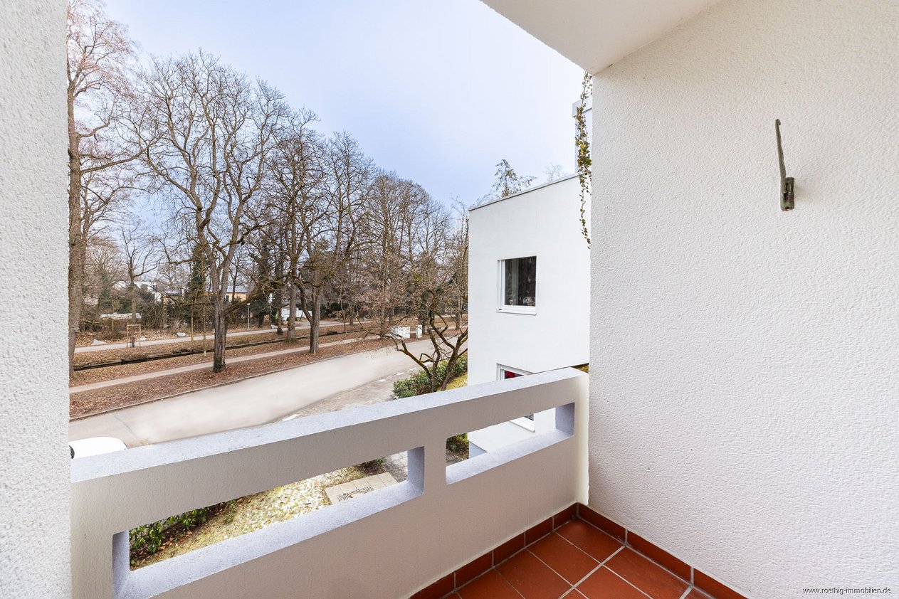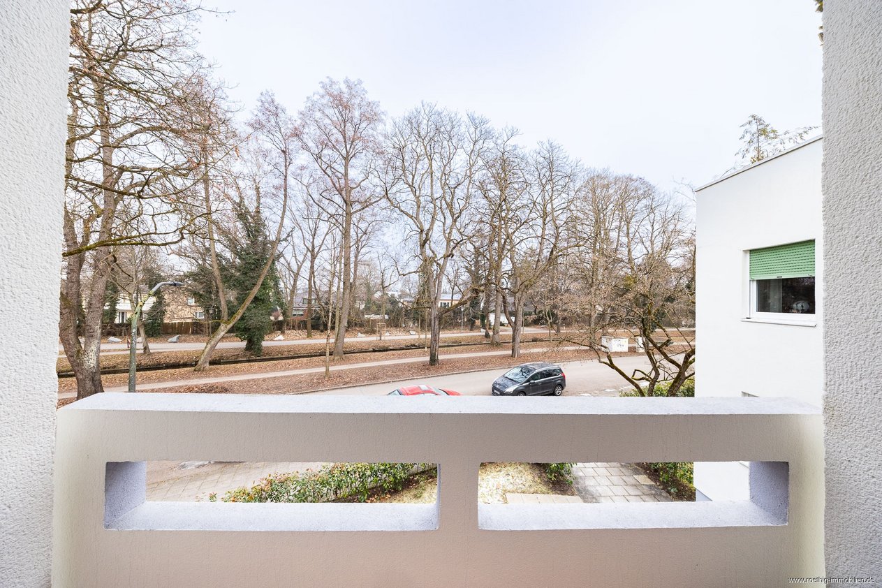Der nach Süden ausgerichtete Balkon ergänzt das Wohnambiente ideal und bietet ein hohes Maß an Privatsphäre sowie eine schöne Aussicht in das umliegende Grün und auf die gepflegte Nachbarschaft von Obermenzing.