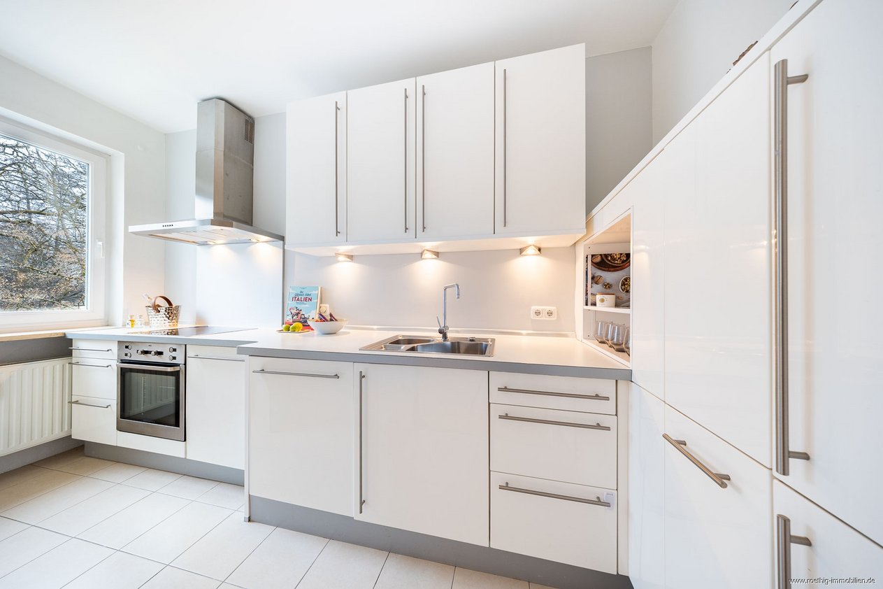 Das Esszimmer grenzt unmittelbar an die Küche an und bietet kurze Wege sowie eine angenehme Verbindung zwischen Kochen und gemeinschaftlichem Beisammensein. Die Einbauküche fügt sich mit ihren zeitlosen weißen Fronten und der weißen Arbeitsfläche harmonisch in das Gesamtbild ein. Sie ist mit einer Kühl-Gefrierkombination, einem Kochfeld und Backofen, einer Dunstabzugshaube sowie einer Geschirrspülmaschine ausgestattet.