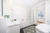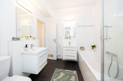 Das angrenzende Badezimmer besticht durch seine Vielseitigkeit: Als Bad en Suite direkt an den Schlafbereich angeschlossen, verfügt es über Badewanne, separate Dusche und zwei Einzelwaschbecken – ideal für einen komfortablen Familienalltag.