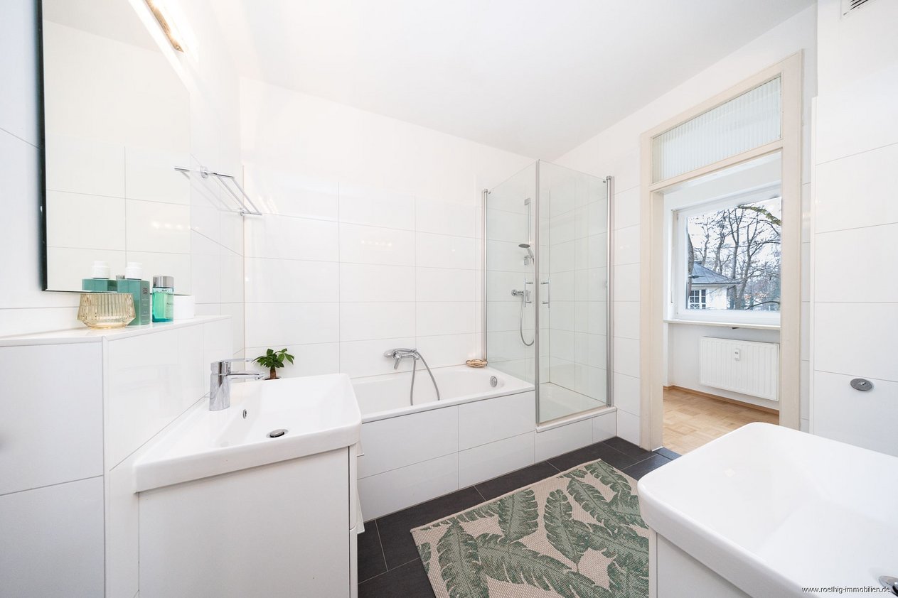 Besonders durchdacht gestaltet sich die Zugänglichkeit des Badezimmers, das sowohl direkt vom Schlafzimmer als auch über den zweiten Flur der Wohnung erreichbar ist und damit Privatsphäre mit funktionaler Flexibilität verbindet.