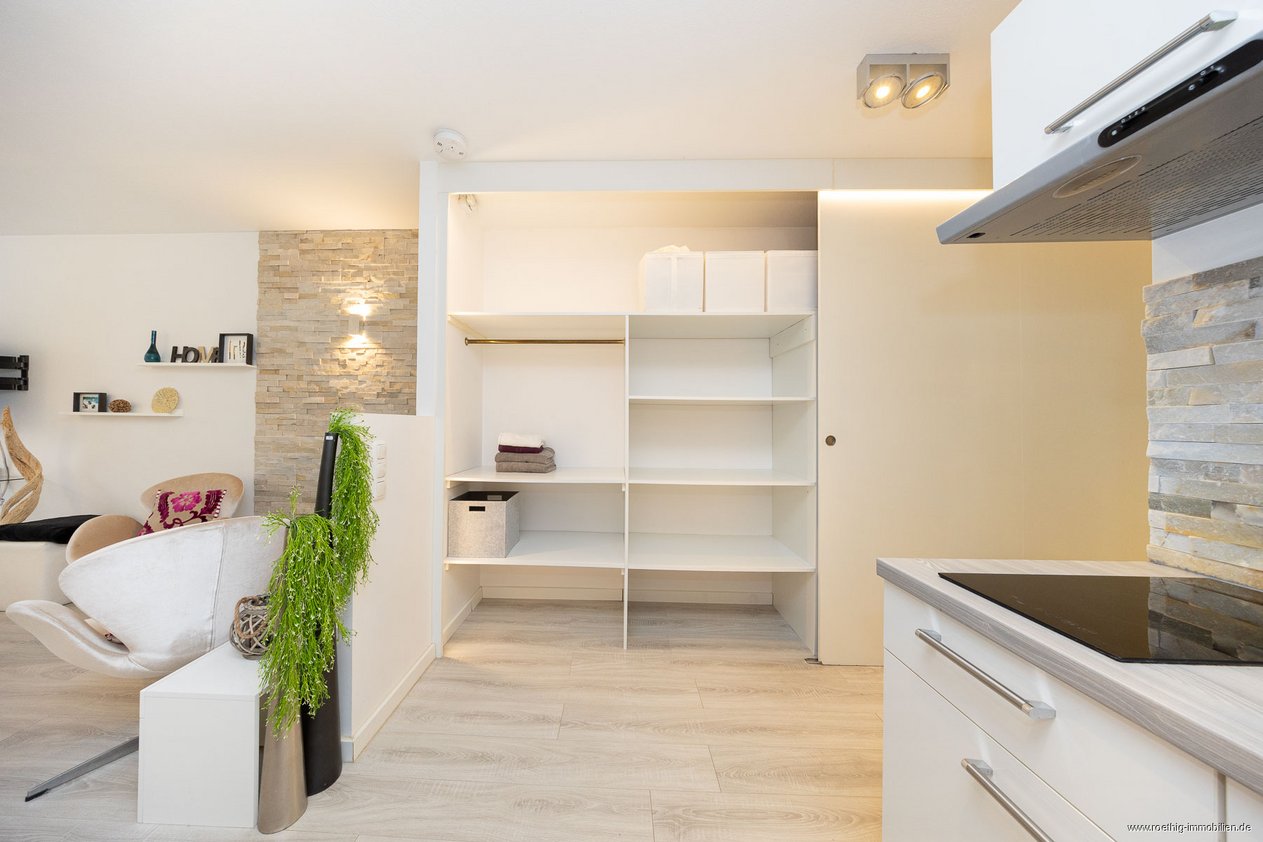 Nach Betreten der Wohnung empfängt Sie ein einladender Eingangsbereich mit ausreichend Platz für Ihre Garderobe. Ein großzügiger Einbauschrank bietet viel Stauraum, während integrierte Deckenleuchten für ein angenehmes und stimmungsvolles Licht sorgen.