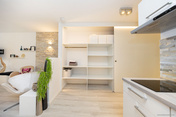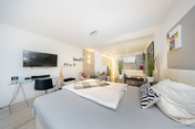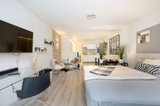 Der Wohnbereich ist ebenso mit einer gemütlichen Sitzecke sowie mit einem Esstisch versehen. Über dem Esstisch befindet sich ein großer Spiegel, der den Raum zusätzlich optisch vergrößert. Für das Arbeiten und Lernen von Zuhause ist ein Schreibtisch integriert. Vom Bett aus sorgt der verstellbare, an der Wand montierte Fernseher für Unterhaltung.