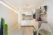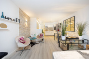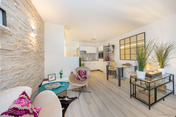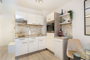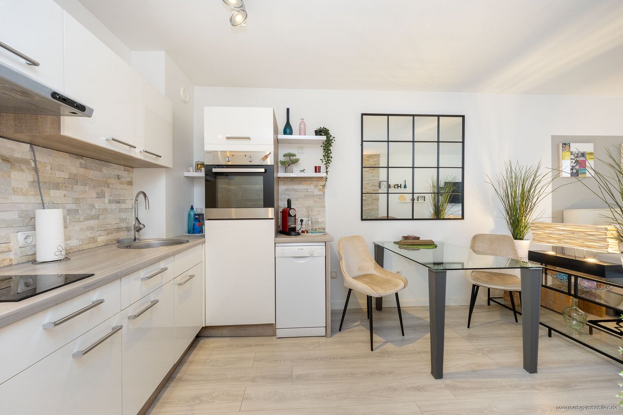 Geradeaus öffnet sich der großzügige Wohn- und Essbereich mit offener Küche, der das Herzstück der Wohnung bildet. Die Einbauküche ist mit allen wichtigen Elektrogeräten ausgestattet – darunter ein Herd, ein Ofen, eine Spülmaschine sowie ein Kühlschrank mit Gefrierfach. Eine dekorative Steinverblendung an der Wand verleiht dem Raum eine moderne, einladende Atmosphäre und unterstreicht das hochwertige Gesamtbild.