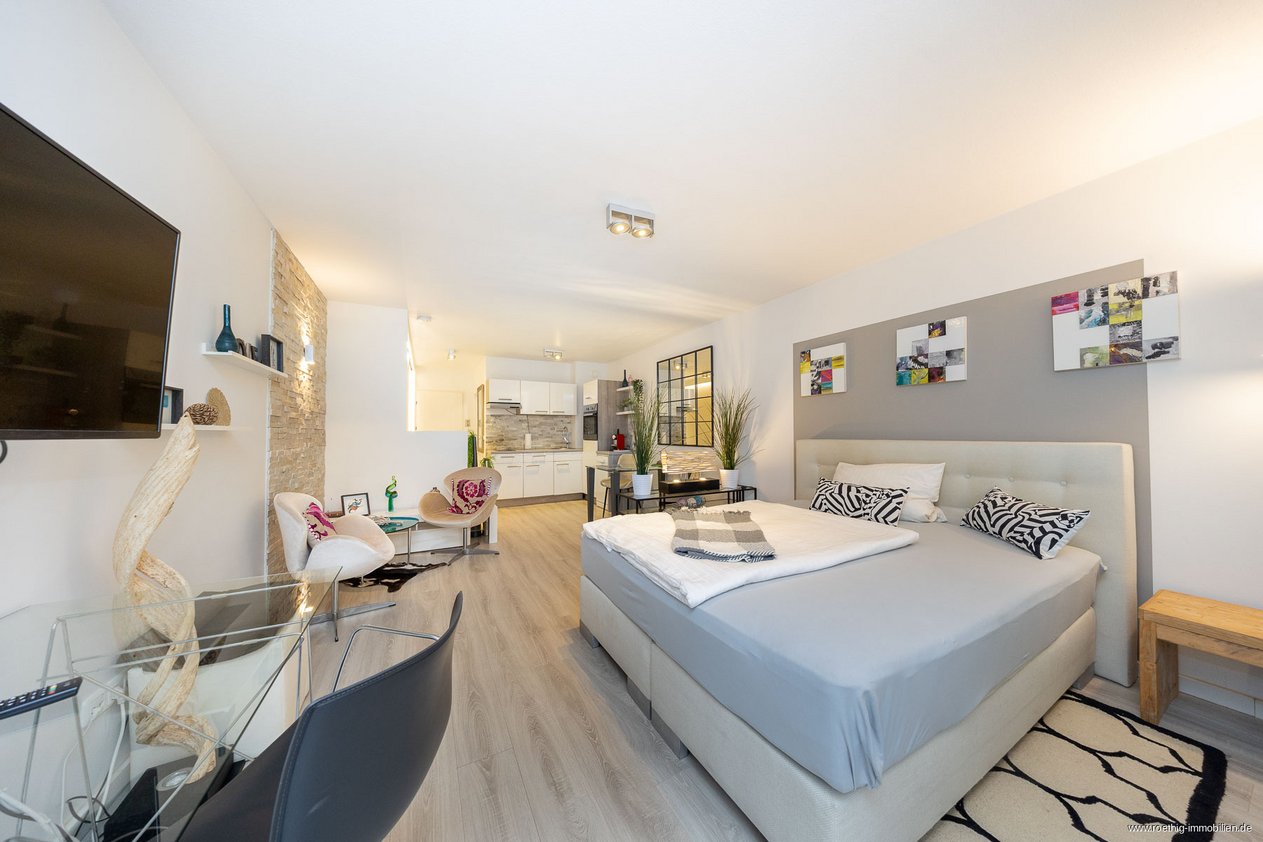 Der Mindestgebotspreis für diese möblierte 1-Zimmer-Wohnung mit Balkon und Kellerabteil beträgt € 350.000,-