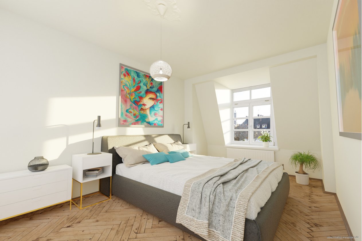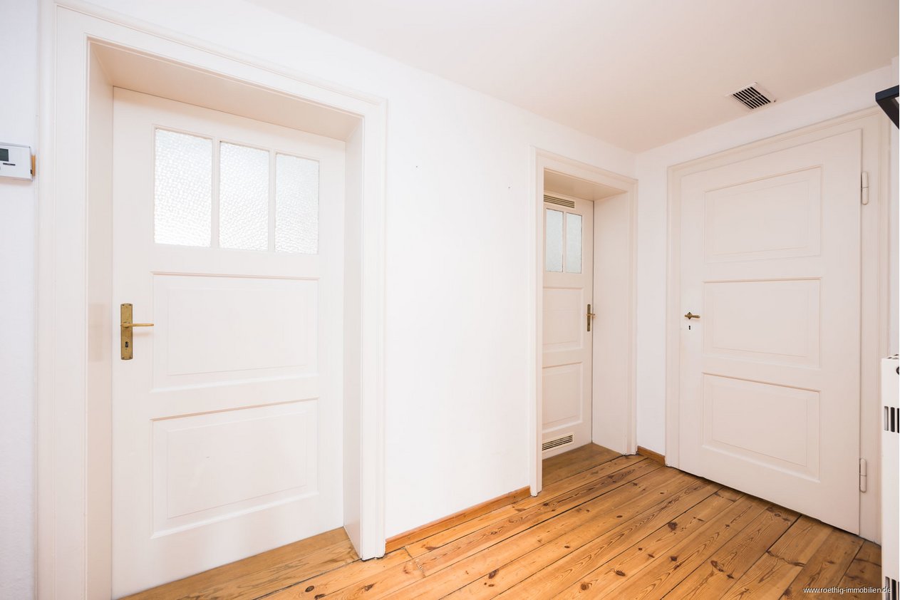 Diese großzügige und einladende Wohnung ist aktuell vermietet und befindet sich im vierten und obersten Geschoss eines äußerst gepflegten Altbau-Mehrfamilienhauses, das im Jahr 1932 errichtet wurde. Dieses Schmuckstück erreichen Sie über das helle Treppenhaus, welches mit einem rustikalen Holzboden ausgestattet ist.