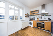 Am rechten Ende des Flurs befindet sich die große, helle Wohnküche. Diese verfügt über eine Einbauküche mit neuwertigen Elektrogeräten und über einen Waschmaschinenanschluss. Dank des großzügigen Schnittes lässt sich außerdem ein Esstisch gut integrieren. Eine zusätzliche Speisekammer bietet genügend Stauraum für all Ihre Lebensmittelvorräte sowie Küchengeräte. Die große Fensterfront versorgt diesen Raum mit viel Tageslicht. Außerdem bietet die Küche den direkten Zugang zum idyllischen Süd-Balkon, welcher zu gemütlichen Abenden mit Freunden oder der Familie einlädt.