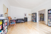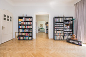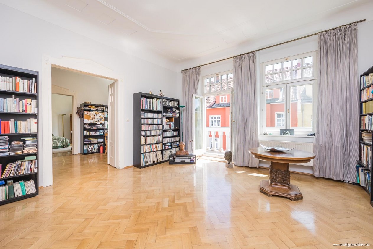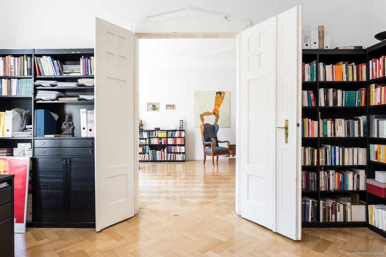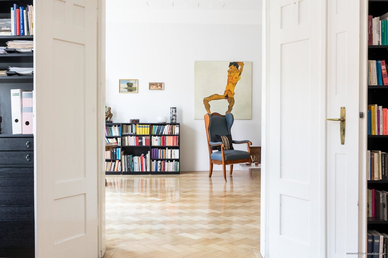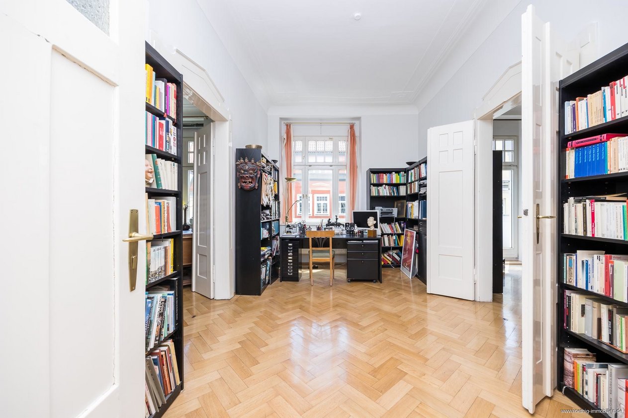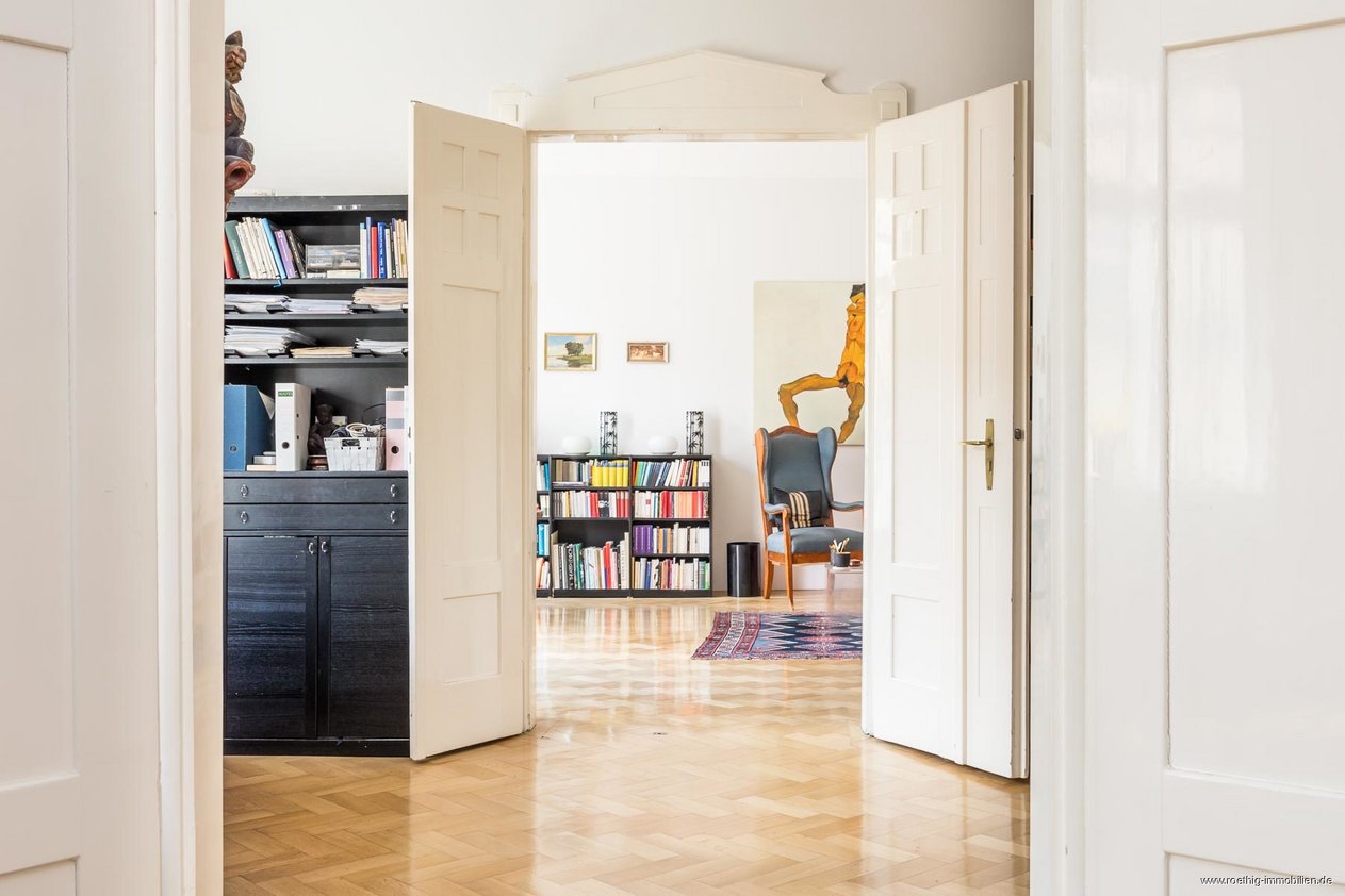 Das zweite, lichtdurchflutete Zimmer erreichen Sie über den Flur und zusätzlich über die zwei angrenzenden Räume mit historischen Flügeltüren und kunstvollen Verzierungen. Dieses eignet sich aufgrund seiner Lage, gegenüber der Wohnküche, perfekt als Ess- bzw. Arbeitszimmer oder Bibliothek.