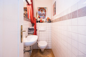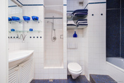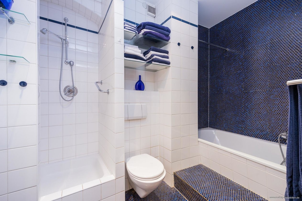 Gegenüber der Wohnungseingangstür befindet sich das Badezimmer. Es verfügt sowohl über eine Badewanne als auch eine ummauerte Dusche. Zusätzlich besitzt die Wohnung ein Gäste-WC.