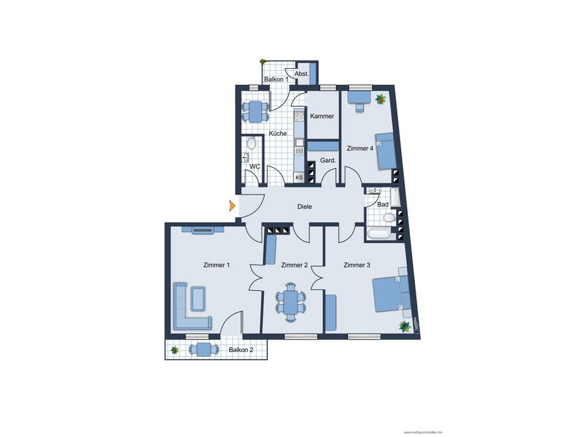 Rechter Hand liegt das erste weitläufige Zimmer mit einem wunderschönen Süd/Westbalkon, der über die gesamte Raumbreite verläuft. Dieser Raum bietet aufgrund seines idealen Schnittes eine Vielzahl an Gestaltungsmöglichkeiten für Ihr Interior. Die derzeitige Eigentümerin nutzt diesen lichtdurchfluteten Bereich als Wohnzimmer.