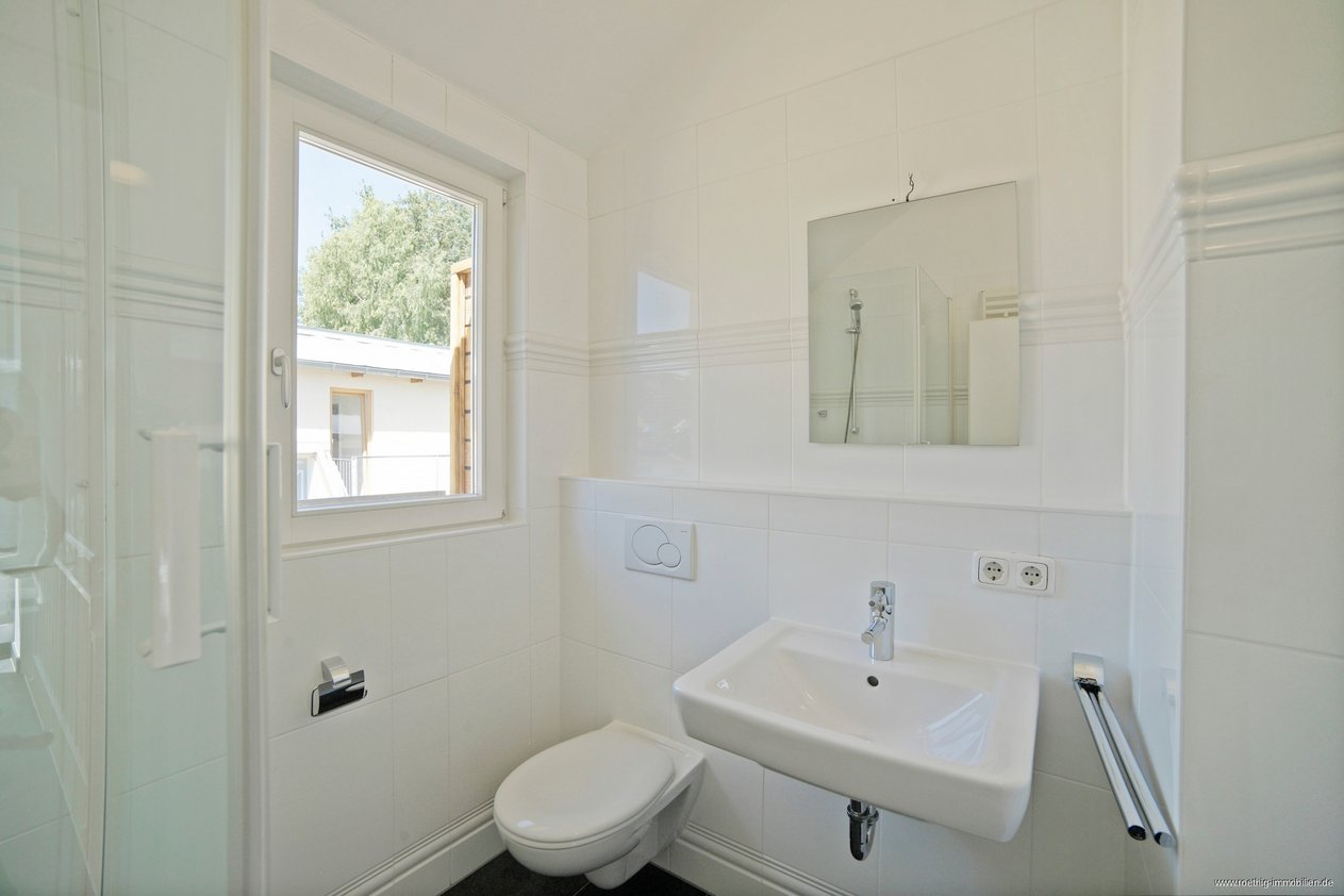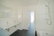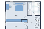 Über das helle und freundliche Treppenhaus gelangen Sie ins Obergeschoss. Auf dieser Etage befinden sich zwei sonnige Schlafzimmer, eine kleine Abstellkammer sowie das Hauptbad. Beide Schlafräume verfügen ebenfalls über bodentiefe Fenster. Wie im Wohnbereich ist auch hier ein Parkettboden aus Massivholz verlegt. Das Bad ist weiß gefliest und verfügt neben einer Badewanne auch noch über eine separate Dusche und einen Doppelwaschtisch.