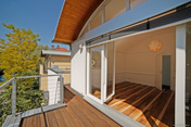 Ein weiteres Highlight dieses Hauses ist das Dachgeschoss mit dem Studio. Durch die ausgefallene Architektur des Hauses und dem damit einhergehenden Tonnendach, ergibt sich in diesem Raum eine großartige Deckenhöhe. Eine nach Westen ausgerichtete große, bodentiefe Fensterfront lässt den Raum noch großzügiger erscheinen. Über eine Flügeltür haben Sie Zugang zur Dachterrasse, welche um die gesamte Etage verläuft. Zusätzlich befindet sich auf dieser Ebene noch ein separates Duschbad mit Fenster. Eine Abstellkammer, welche über die Terrasse zu erreichen ist, bietet Ihnen die Möglichkeit Terrassenmöbel oder den Grill über die Wintermonate sicher zu verstauen.
