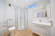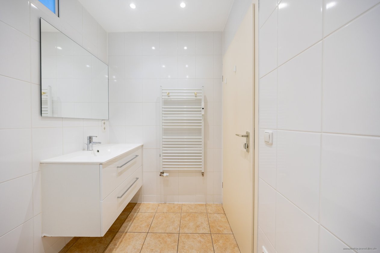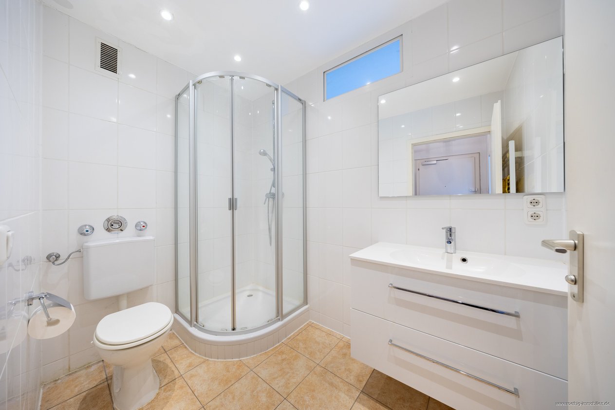 Gegenüberliegend befindet sich das Badezimmer, das mit einer Dusche, einem WC, einem Waschbecken, einem Handtuchheizkörper sowie einer Lüftung ausgestattet ist. Ein Fenster in Richtung Küche macht es zu einem Tageslichtbad und die Deckenspots sorgen für eine angenehme Beleuchtung.