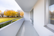 Der ca. 10 m² große, überdachte Balkon ist nach Osten ausgerichtet und bietet einen herrlichen Ausblick ins Grüne. Der ideale Ort für ein entspanntes Frühstück im Freien oder gemütliche Feierabende mit der Familie und Freunden.