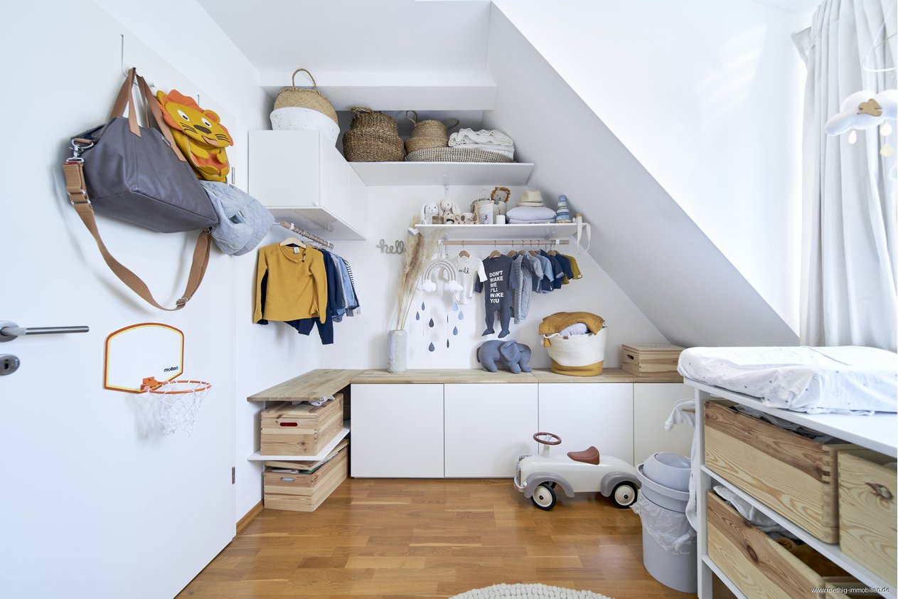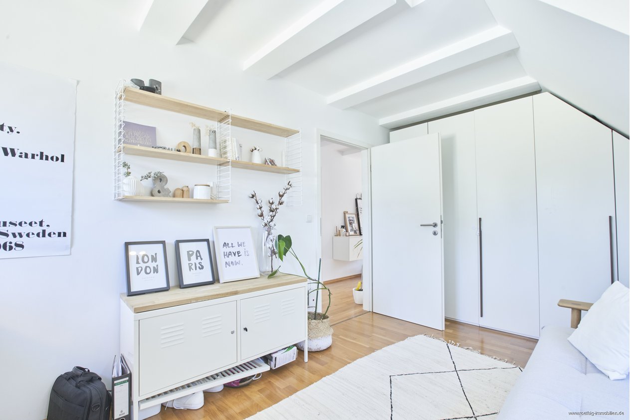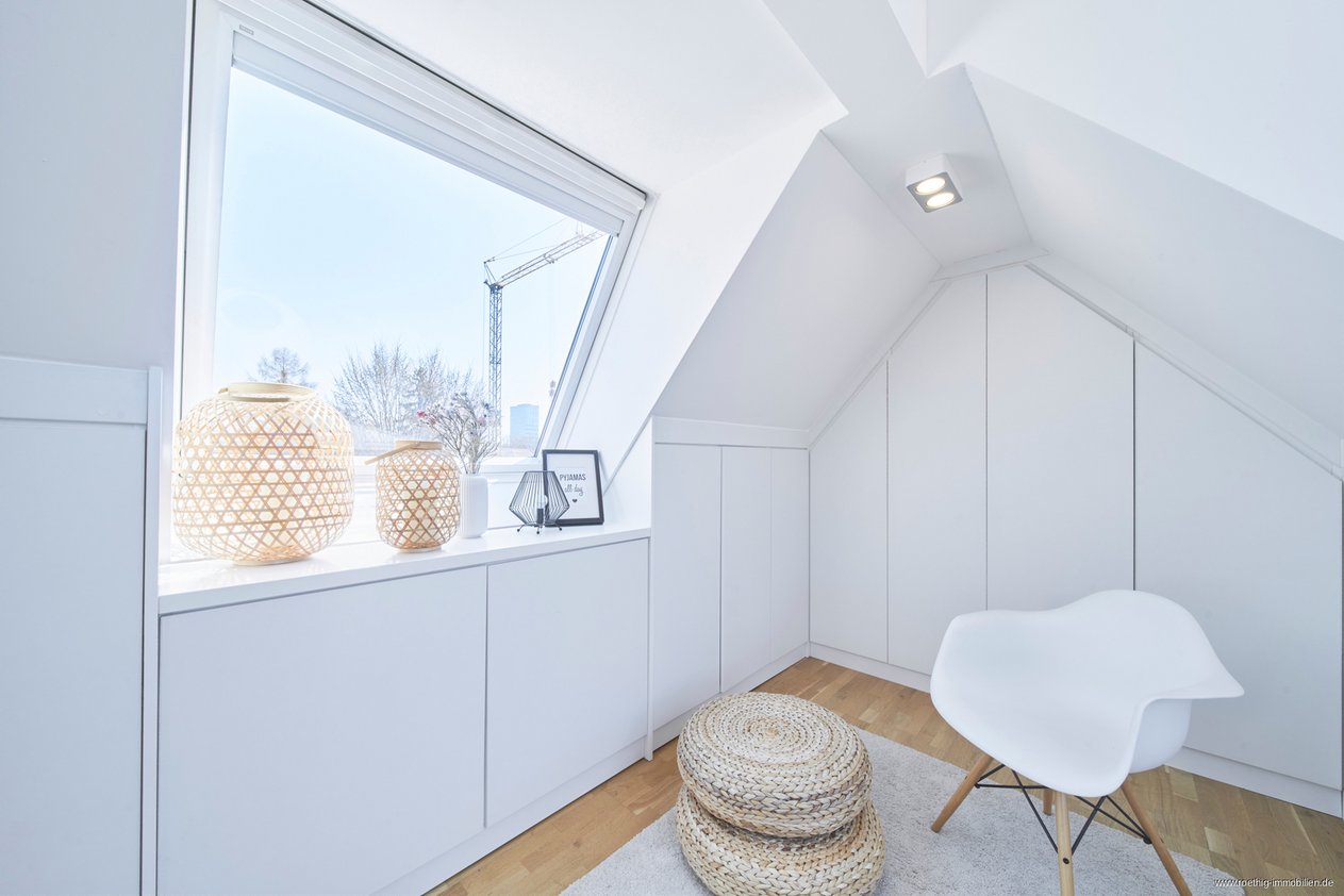 Im Wohnraum führt eine moderne Wendeltreppe mit weißem Geländer und Stufen aus massivem Holz in das Dachgeschoss und somit zum gemütlichen Elternschlafzimmer. Drei große Dachfenster sorgen für einen lichtdurchfluteten Raum. Eine gemütliche Oase, in der man fernab von allem entspannen kann und zusätzlichen Platz beispielsweise für eine Leseecke bietet. Großzügige, maßgefertigte Einbauschränke schaffen eine optimale Raumnutzung und bieten ausreichend Platz für Ihre Garderobe. Hier bleiben keine Wünsche offen.