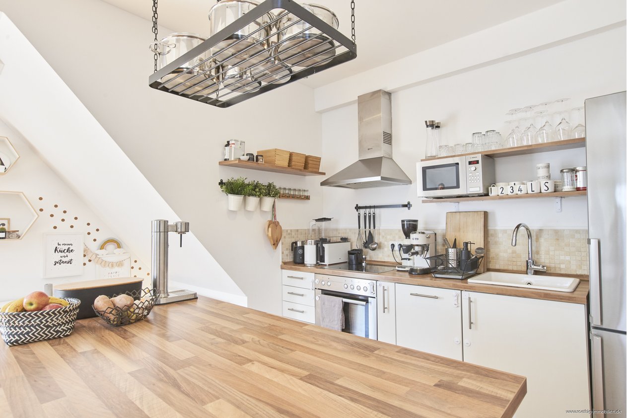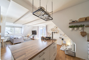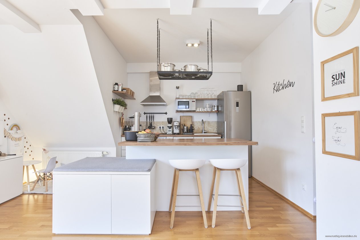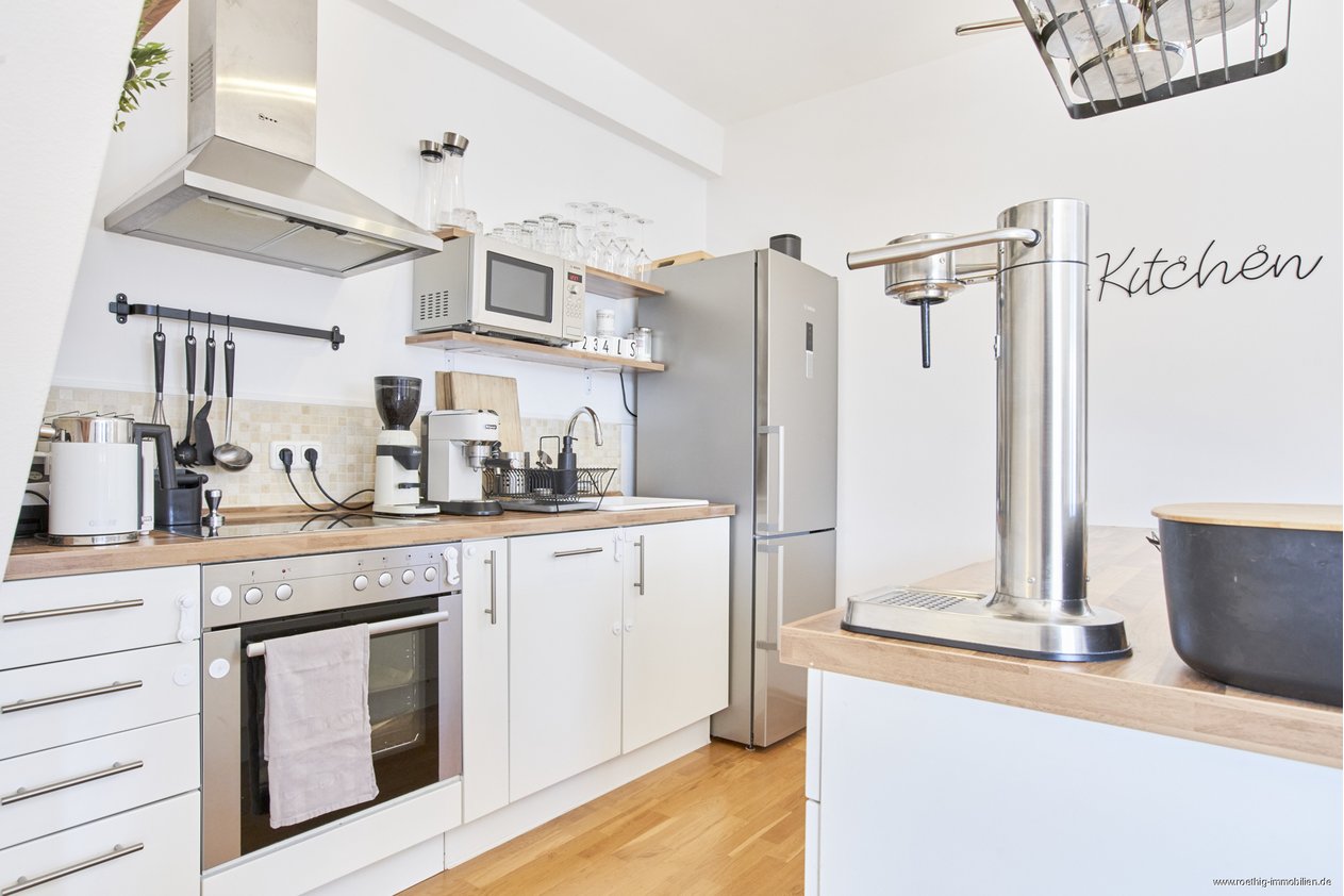 Die offen gestaltete Küche mit Einbauten und zusätzlicher Kücheninsel fügt sich optisch harmonisch in das Raumgefüge ein. Die Küche ist mit allen technischen Geräten ausgestattet und überzeugt, wie auch die Kücheninsel, durch genügend Stauraum für den täglichen Küchenbedarf.