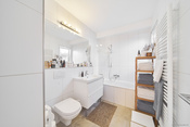 Das angrenzende, weiß geflieste Tageslichtbad mit ansprechenden beigen Bodenfliesen präsentiert sich modern und elegant. Geschmackvolle Armaturen, eine Badewanne sowie ein Handtuchheizkörper sorgen für Komfort.