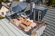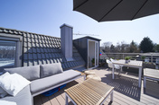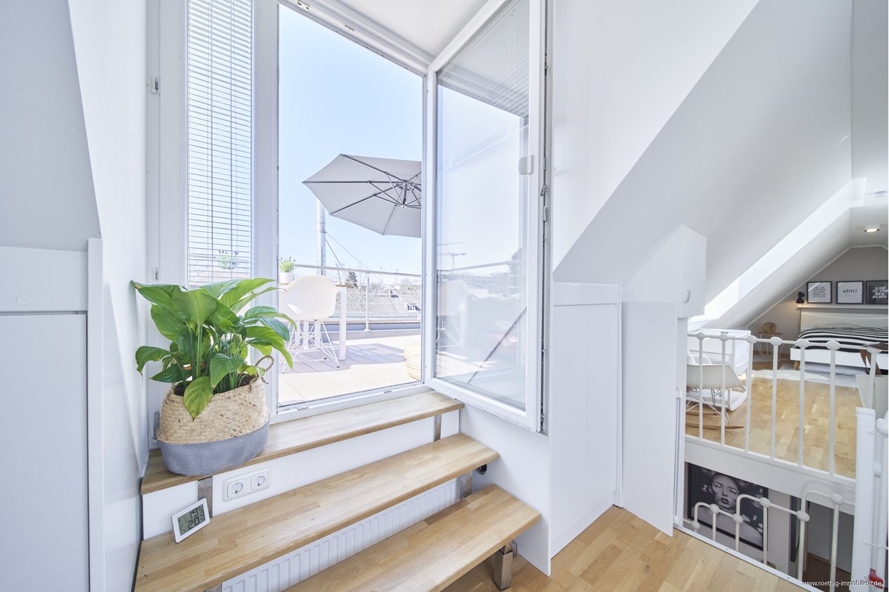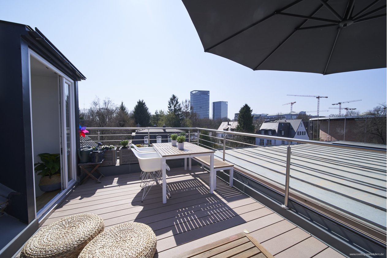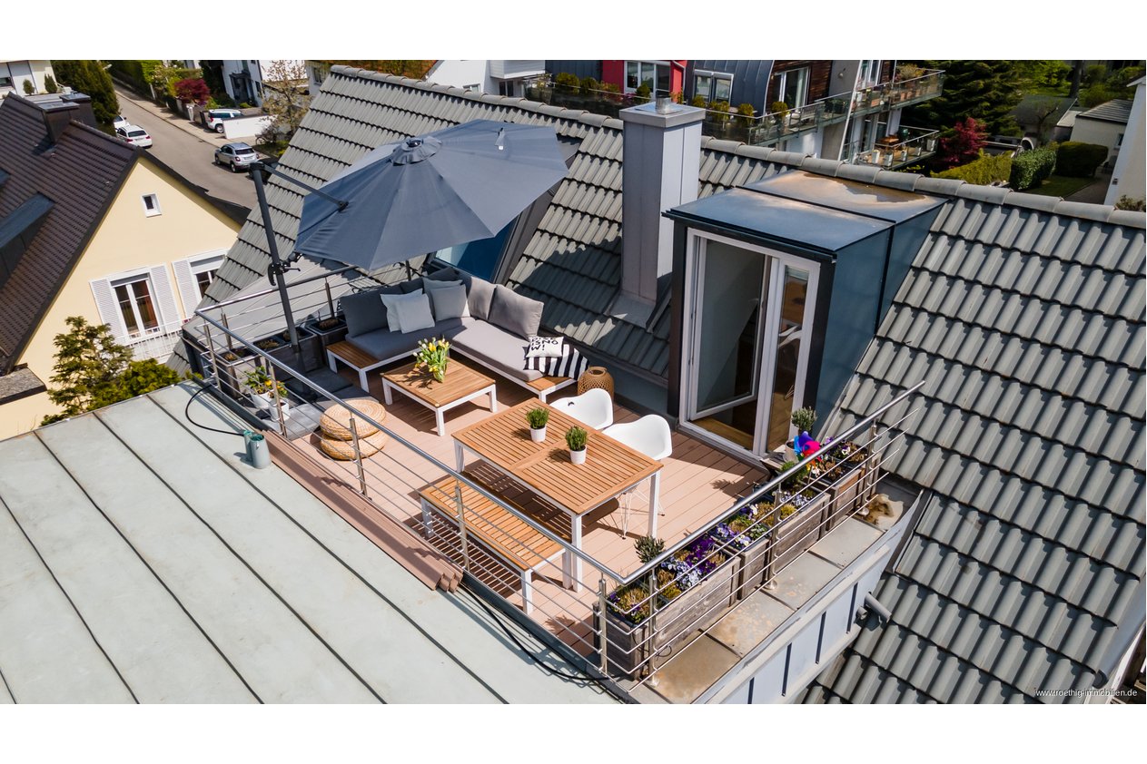 Das besondere Highlight dieser traumhaften Wohnung ist die großzügige, sonnenverwöhnte Dachterrasse mit Westausrichtung, auf welche Sie Zugang vom Elternschlafzimmer über eine kleine Treppe haben. Dieser Ort lädt für gemeinsame Abende mit Familie und Freunden ein und bietet aufgrund der einzigartigen Höhe Privatsphäre und einen traumhaften Ausblick. Der Großstadt entflohen, vermittelt sie über den Dächern Münchens ein Gefühl der Gelassenheit und Ruhe.