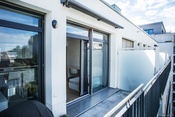 Über eine große Fenstertür gelangt man auf den zum Innenhof hin ausgerichteten West-Balkon. Durch eine Markise kann man hier an heißen Tagen für Schatten sorgen.