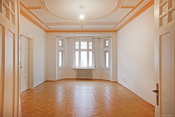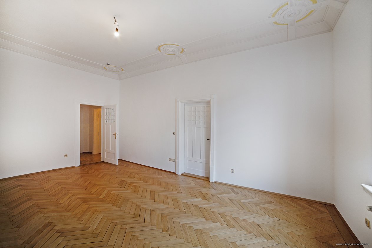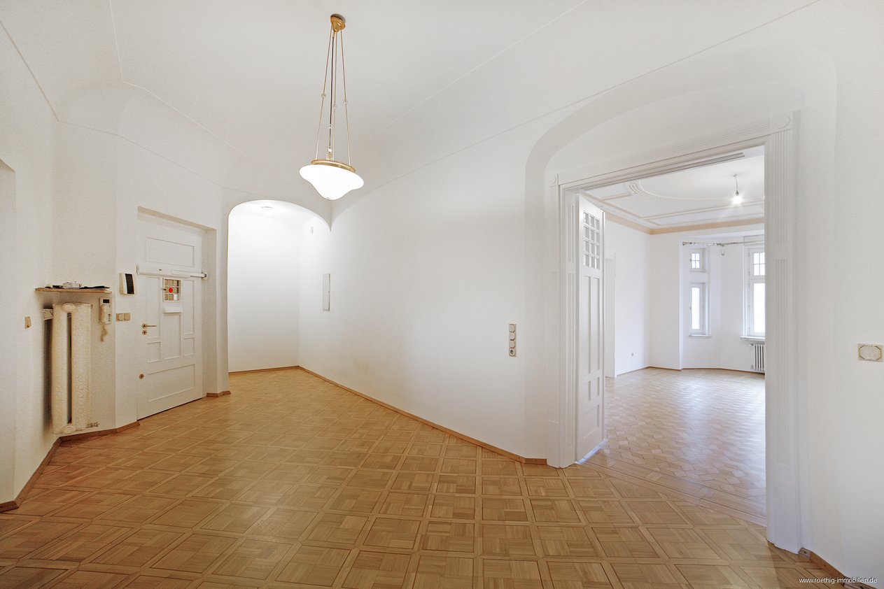 Vom feudalen Treppenhaus betreten Sie die Wohnung und werden von einem überaus weitläufigen Flur, mit stolzen 36 m², empfangen. In diesem Bereich finden Sie viel Platz für eine Garderobe, ein Sideboard und weiteres Interior. Der historische und hochwertige Parkettboden, welcher in allen Wohnräumen verlegt ist, versprüht bereits im Eingangsbereich seinen Charme.