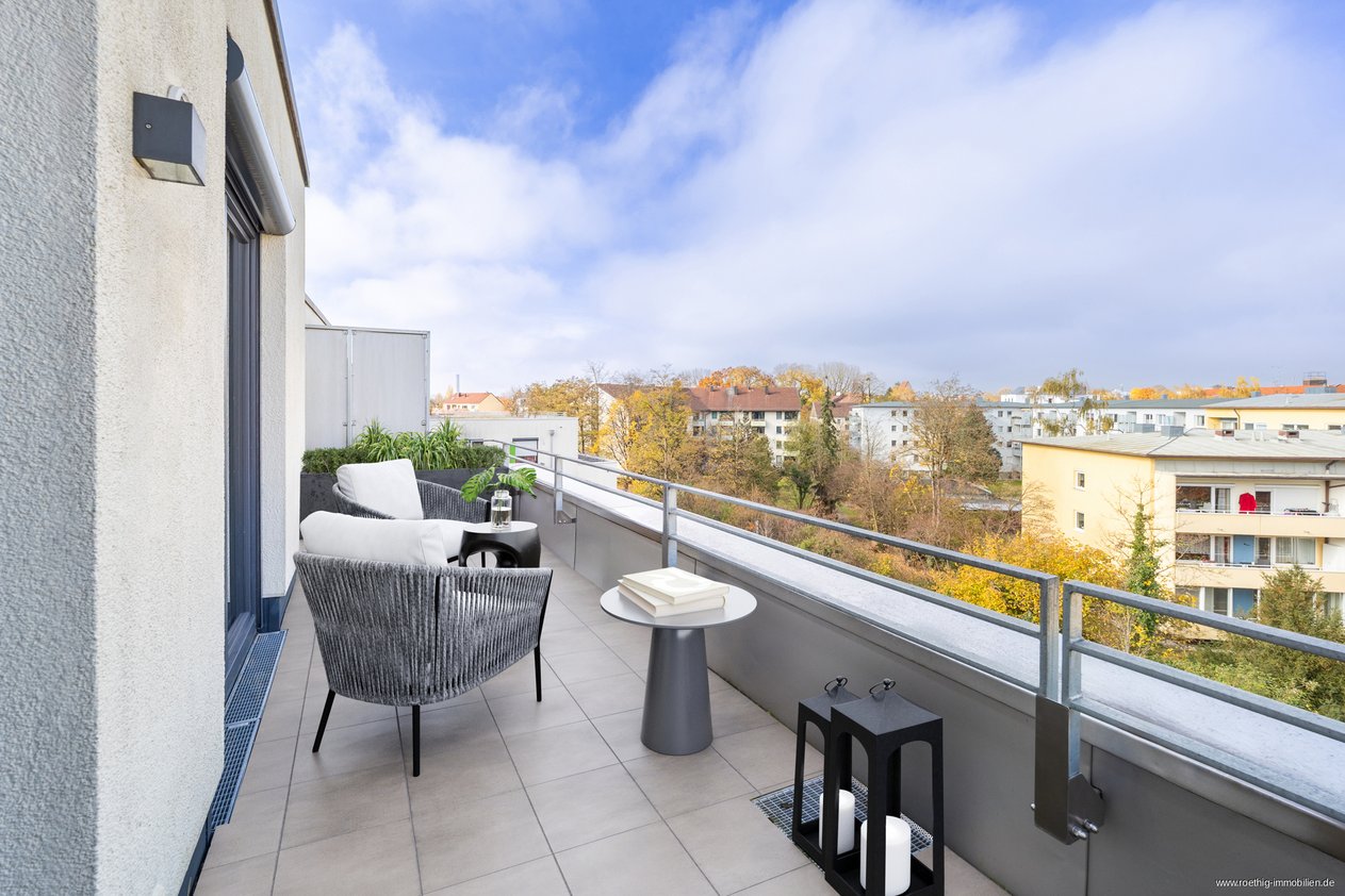 Der offen gestaltete Wohnbereich vereint modernes Design mit hoher Wohnqualität. Bodentiefe, dreifachverglaste Fensterfronten sorgen für einen lichtdurchfluteten Raum und öffnen den Blick auf die beeindruckende, ca. 16 m² große Dachterrasse – ein weiteres Highlight dieser Wohnung.