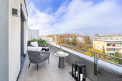 Die Terrasse liegt ruhig zum begrünten Innenhof und bietet durch ihre hohe Lage nicht nur Privatsphäre, sondern auch einen wunderbaren Ausblick ins Grüne. Ideal für gemütliche Sommerabende, für ein Frühstück im Freien oder entspannte Lesestunden. Eine Stromquelle sowie die Beleuchtung runden den Außenbereich ab.
