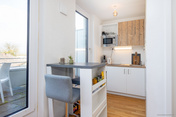 Die Küche fügt sich harmonisch in den Wohnraum ein und ist mit einem Cerankochfeld, Kühlschrank, Unterschrank und einer Mikrowelle ausgestattet.