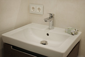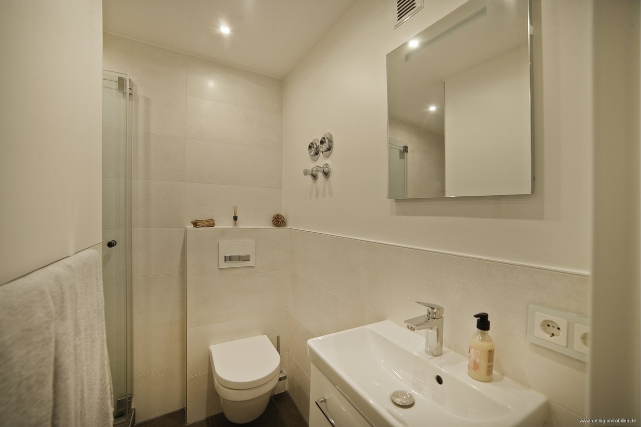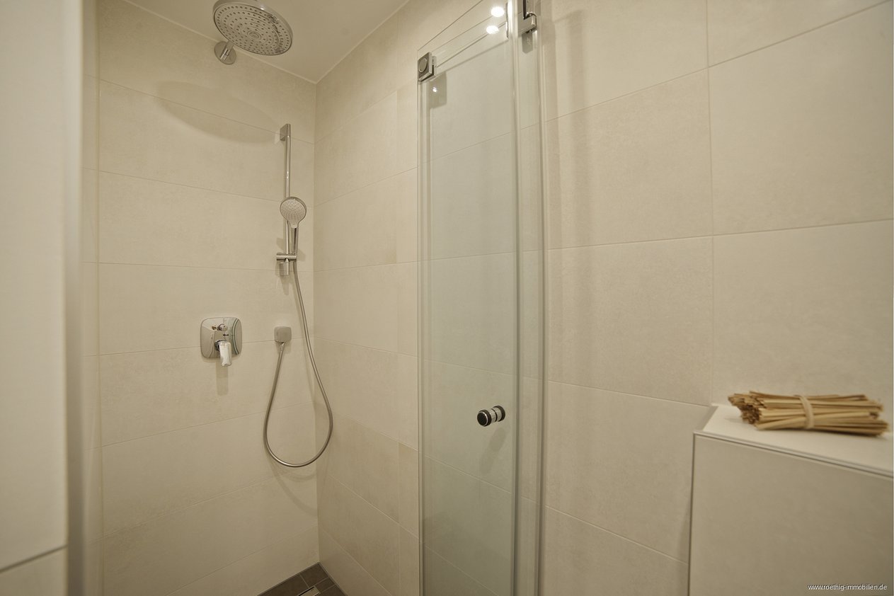 In der Wohnung befinden sich weiterhin eine Abstellkammer, ein Gäste-WC mit Dusche und das Hauptbad mit Badewanne. In beiden Bädern wurden keine Kosten gescheut und hochwertige Materialen verbaut. Somit wirken die innenliegenden Bäder trotzdem hell und modern.