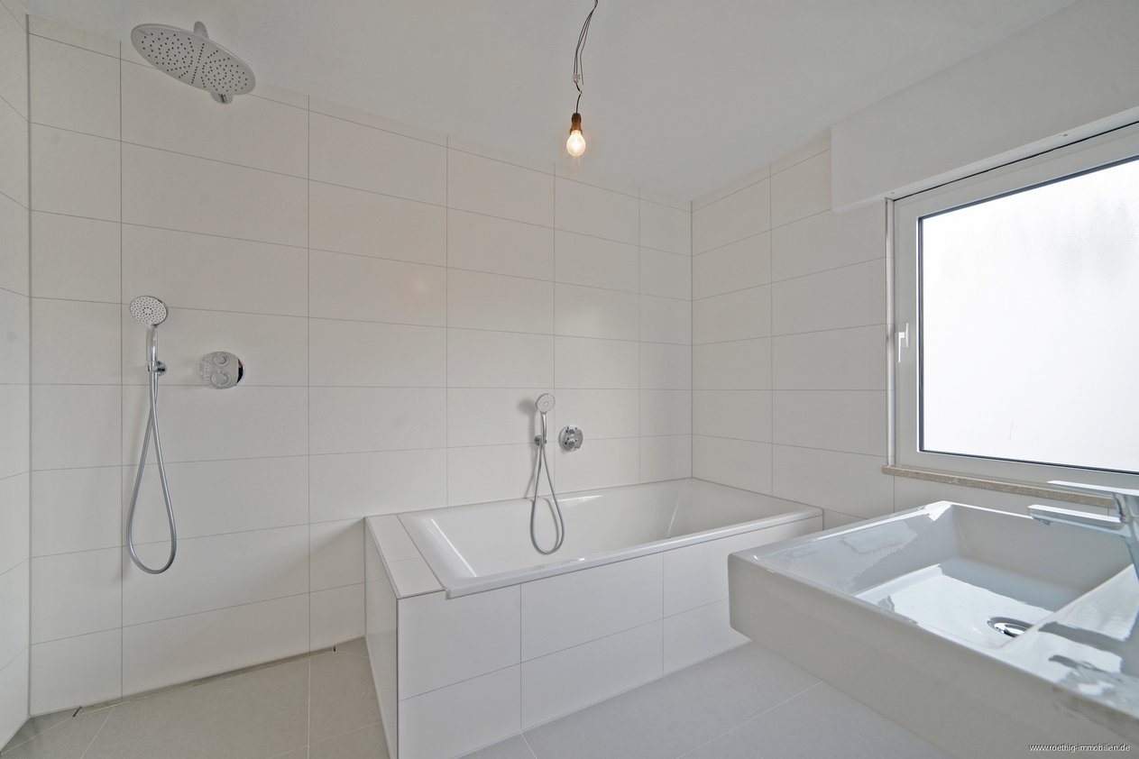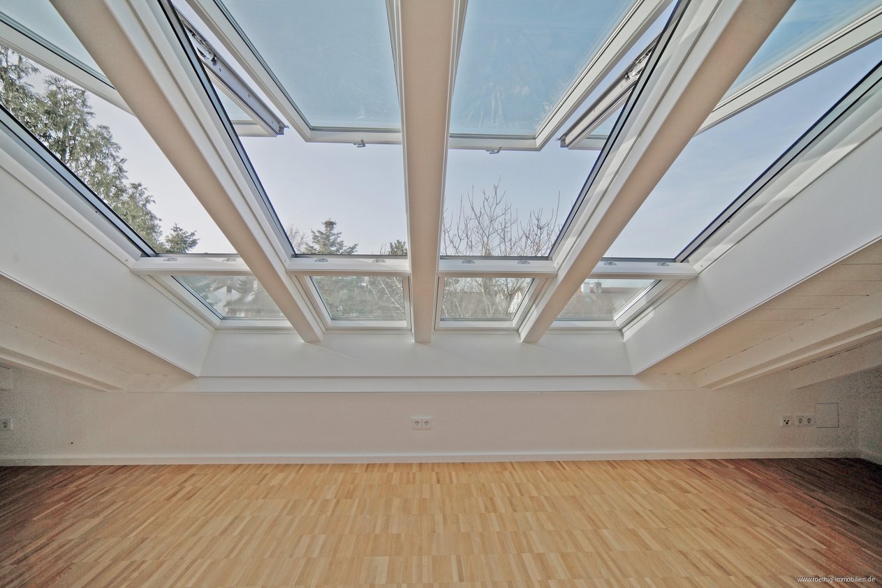 Im Dachgeschoß befindet sich das dritte Schlafzimmer der Doppelhaushälfte, sowie ein modernes Tageslichtbad mit Dusche. Auf dieser Etage wäre das Hauptschlafzimmer denkbar. Ein großes Bett und an die Schrägen angepasste Schränke können hier untergebracht werden. Dank der vielen Dachfenster ist dieser Raum sonnenverwöhnt und die Dachschrägen geben dem Raum eine gemütliche Atmosphäre.