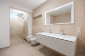 Über einen Flur mit perfekt platzierten Einbauschränken kommen Sie linkerhand in das hochwertig ausgestattete Gästebadezimmer mit bodengleicher Regendusche und hochwertigen Armaturen. Durch einen modernen, beleuchteten Spiegel sowie raumbreite Oberlichter wird der Raum durchwegs erhellt. Die Anschlüsse für eine Waschmaschine sowie einen Trockner sind ebenfalls platzsparend in diesem Bereich integriert.