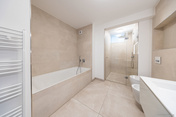 Das hochwertige Masterbadezimmer überzeugt mit einem stimmigen Gestaltungskonzept aus eleganten Keramikfliesen in warmen Erdtönen und stilvollen, weißen Akzenten. Über dem edlen Doppelwaschtisch befindet sich ein beleuchteter Spiegel, während in die Wand eingelassene Nischen praktische Ablageflächen für Kosmetik und Dekoration bieten. Die bodentiefe Regendusche mit Glasabtrennung fügt sich nahtlos ins Gesamtbild ein. Ergänzt wird das exklusive Ambiente durch ein zusätzliches Bidet, eine großzügige Badewanne mit Handbrause sowie einen Handtuchheizkörper.