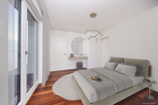 Linker Hand befindet sich das erste Schlafzimmer mit einer Größe von ca. 20 m². Die großflächigen Fenster sowie die bodentiefe Terrassentür lassen viel Tageslicht hinein und bieten gleichzeitig eine wunderschöne Aussicht auf die Paulskirche – eine der ersten Kirchen der Ludwigsvorstadt.