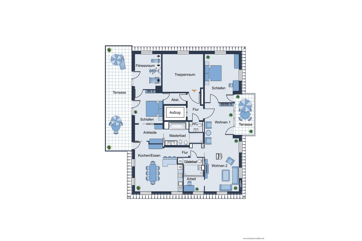 Hinweis: Alternativ lässt sich der Essbereich auch problemlos in ein weiteres Schlafzimmer umwandeln, während der Küchenbereich in den Wohnbereich integriert werden kann.
