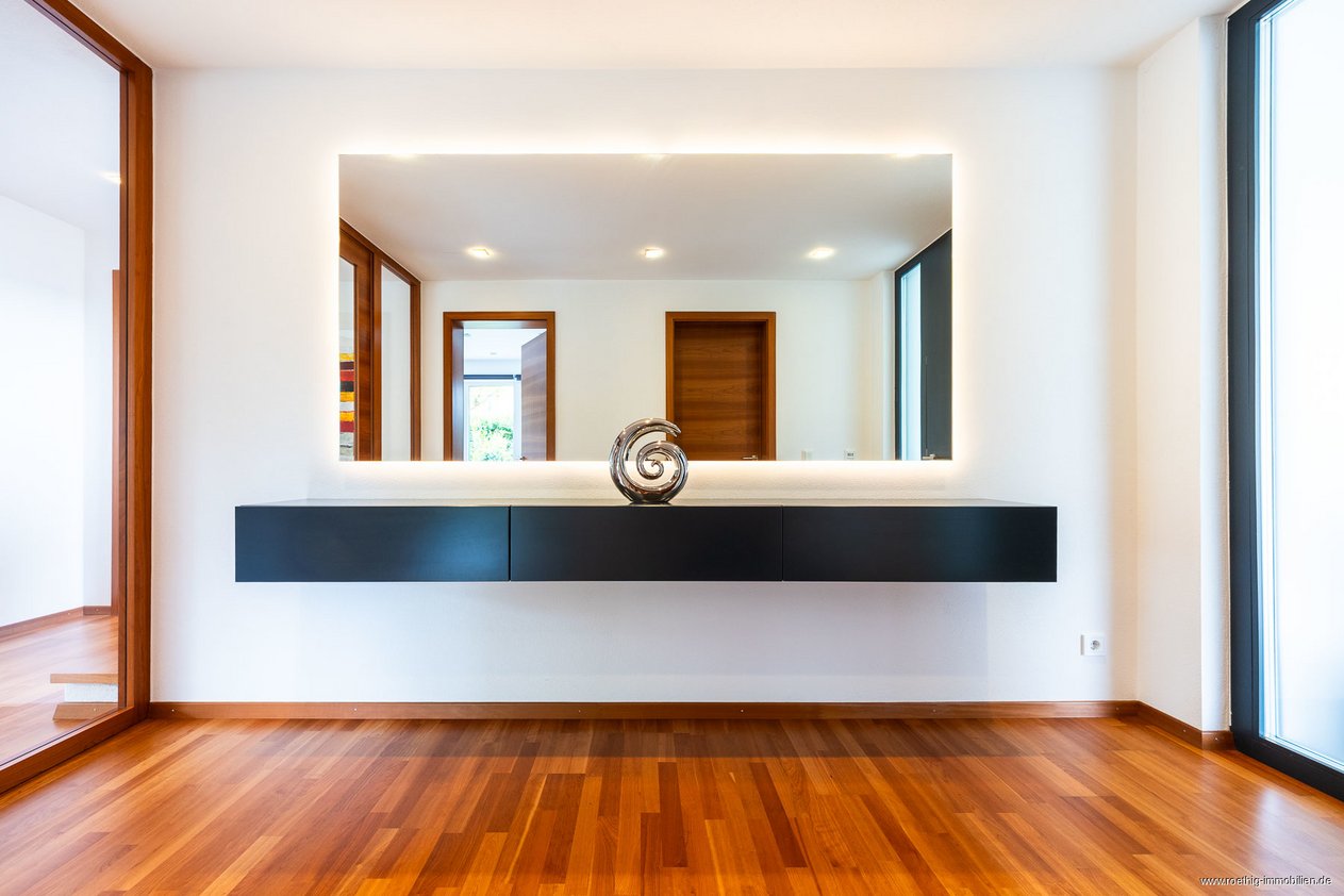 Im gesamten Haus wurde edler Parkettboden sowie stilvolles Feinsteinzeug verlegt. Sämtliche Glasfronten sind dreifach verglast, bodentief und teilweise raumhoch ausgeführt – für maximale Belichtung. Die individuell regulierbare Fußbodenheizung sorgt in allen Räumen für angenehme Wärme. In Küche, Essen und Wohnen wurde zusätzlich eine Wandheizung verbaut. Elektrisch steuerbare Raffstore-Rollläden bieten komfortablen Sonnenschutz im ganzen Haus.