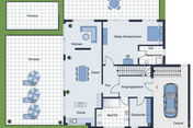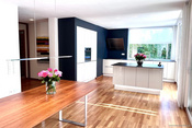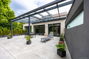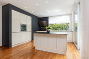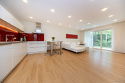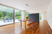 Ein deckenhohes Windfangelement führt in den lichtdurchfluteten Wohn-, Ess- und Küchenbereich – das Herzstück des Hauses. Die exklusive Einbauküche mit großer Insel, harmonischem Essbereich und ca. 12 m langer Glasfront mit drei Schiebetüren öffnet sich zur Süd-West-Terrasse und dem umlaufenden Garten.