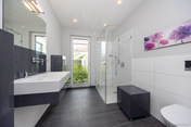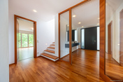 Links des großzügigen Eingangsbereichs befindet sich die Garderobe. Direkt daneben: eines von drei luxuriösen Bädern des Haupthauses mit bodengleicher Walk-In-Dusche und Waschmaschinenanschluss in maßgefertigten Einbaumöbeln.