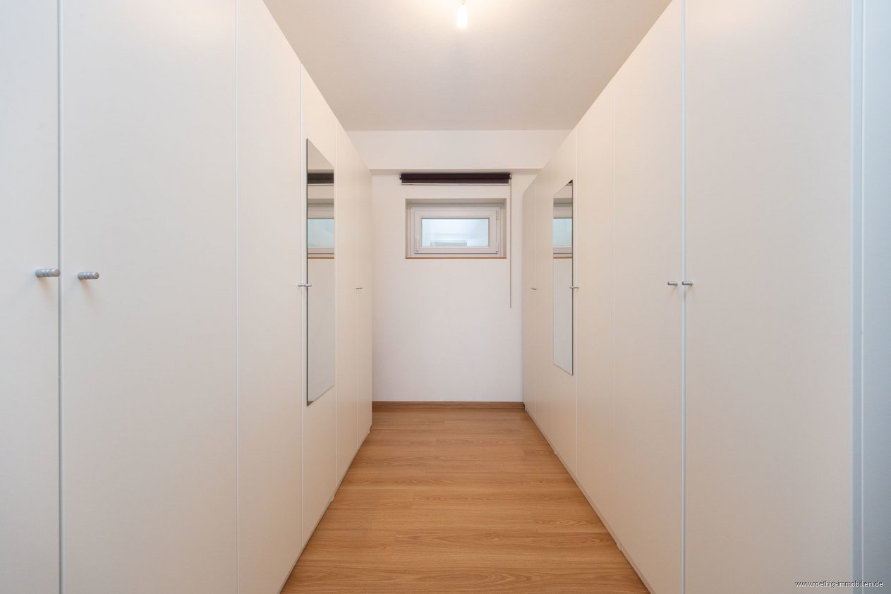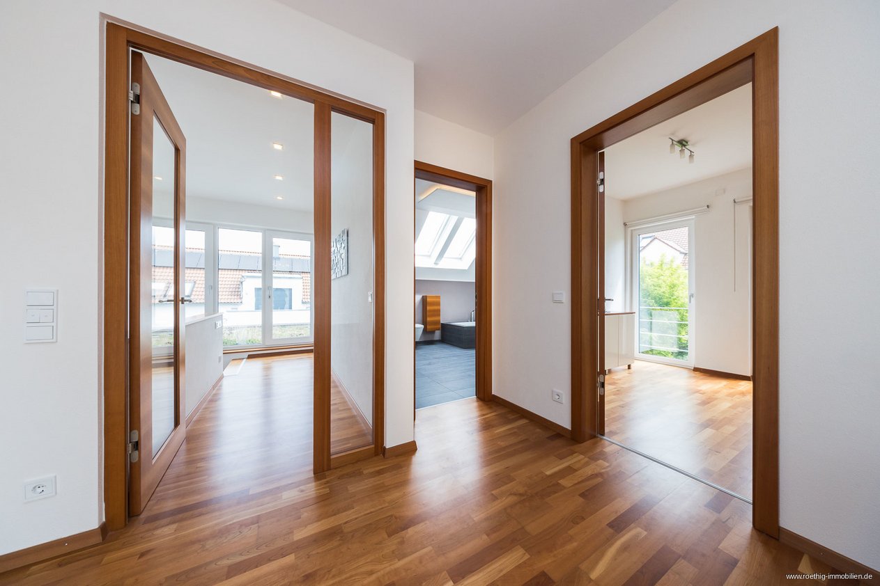 Eine elegante Treppe mit integrierter Beleuchtung führt ins Obergeschoss mit weitläufigem Flur und großzügigem Studiobereich mit ca. 2,78 m Deckenhöhe. Von hier betreten Sie die umlaufende Dachterrasse. Rechterhand des Studiobereichs liegt das Elternschlafzimmer – Ihr persönlicher Rückzugsort, der durch seine Großzügigkeit und eine ruhige Atmosphäre besticht. Ein begehbarer Kleiderschrank, elegant durch eine raumhohe Schiebetür aus satiniertem Glas zugänglich, bietet viel Stauraum für Ihre Garderobe. Angrenzend: ein weiteres Kinderzimmer sowie das exklusive Masterbad mit edlem Feinsteinzeug, bodengleicher Dusche, Eckbadewanne, maßangefertigter Waschtischanlage und großzügigen Fensterflächen.