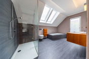 Ein weiteres, ca. 30 m² großes, lichtdurchflutetes Zimmer mit eigenem luxuriösem Bad en suite eignet sich ideal als Gästebereich oder Kinderbereich mit Kinderbad. Im Expose enthalten ist ein Grundrissvorschlag, welcher die Möglichkeit aufzeigt, das große Zimmer in zwei separate Kinderzimmer aufzuteilen.